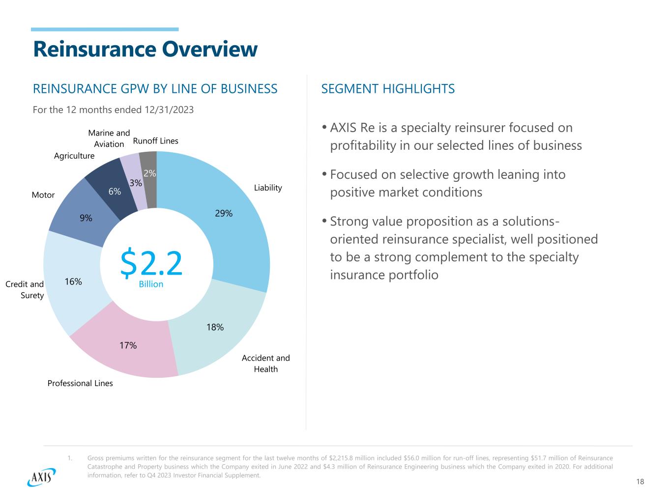 17 Segment Combined Ratio Accelerating Specialty Insurance Growth (1) INSURANCE GPW AND COMBINED RATIO ($ in millions) 1. The combined ratio in 2020 includes $203 million or 8.8 points attributable to the COVID-19 pandemic losses, net of reinsurance and reinstatement premiums. • Leaning into specialty insurance markets, capitalizing on emerging opportunities and taking actions to generate new business, these actions include: - Leveraging our global specialty knowledge to further bring our underwriting acumen to North America across products such as Marine Cargo and Renewable Energy - Continuing to make investments in our Lower Middle Market units to wholesale and retail within North America - Attracting new talent to support our business • AXIS Insurance's ex-cat AY loss ratio is highly attractive at low 50%’s GROWTH UNDERPINNED $6,141 $4,018 $4,863 $5,586 110.4% 91.6% 89.6% 92.5% 80.0% 95.0% 110.0% 125.0% FY2020 FY2021 FY2022 FY2023 Includes 5.1% of prior year development