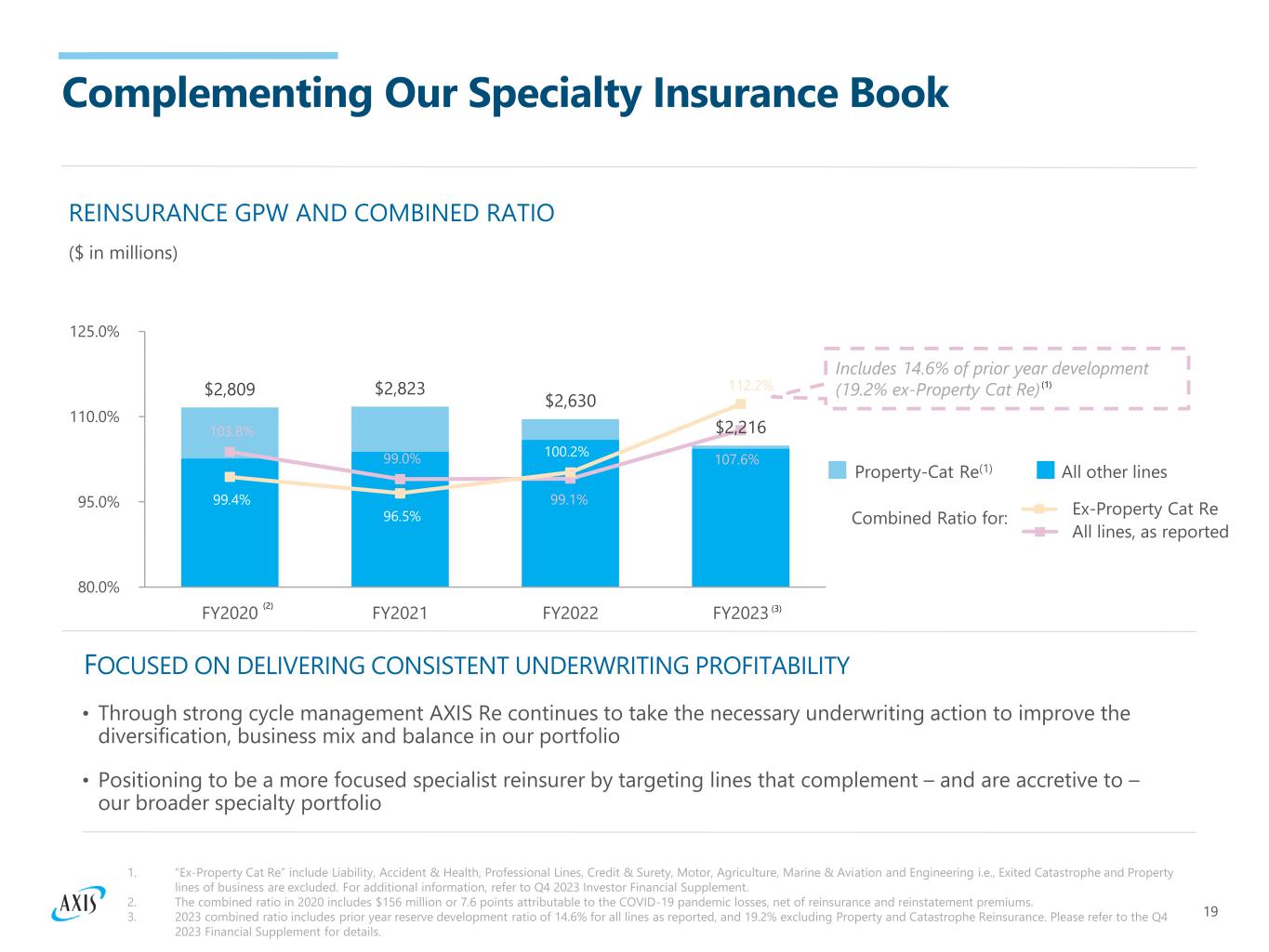 18 Liability Accident and Health Professional Lines Credit and Surety Motor Agriculture Marine and Aviation Runoff Lines 29% 18% 17% 16% 9% 6% 3% 2% 18 Reinsurance Overview SEGMENT HIGHLIGHTS 1. Gross premiums written for the reinsurance segment for the last twelve months of $2,215.8 million included $56.0 million for run-off lines, representing $51.7 million of Reinsurance Catastrophe and Property business which the Company exited in June 2022 and $4.3 million of Reinsurance Engineering business which the Company exited in 2020. For additional information, refer to Q4 2023 Investor Financial Supplement. $2.2 Billion REINSURANCE GPW BY LINE OF BUSINESS For the 12 months ended 12/31/2023 • AXIS Re is a specialty reinsurer focused on profitability in our selected lines of business • Focused on selective growth leaning into positive market conditions • Strong value proposition as a solutions- oriented reinsurance specialist, well positioned to be a strong complement to the specialty insurance portfolio
