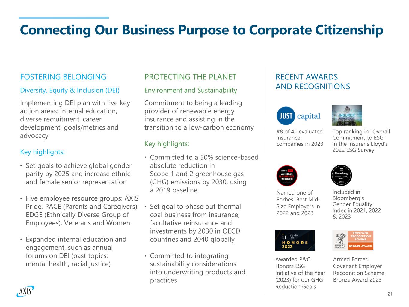 21 Connecting Our Business Purpose to Corporate Citizenship Implementing DEI plan with five key action areas: internal education, diverse recruitment, career development, goals/metrics and advocacy Key highlights: • Set goals to achieve global gender parity by 2025 and increase ethnic and female senior representation • Five employee resource groups: AXIS Pride, PACE (Parents and Caregivers), EDGE (Ethnically Diverse Group of Employees), Veterans and Women • Expanded internal education and engagement, such as annual forums on DEI (past topics: mental health, racial justice) FOSTERING BELONGING Diversity, Equity & Inclusion (DEI) Commitment to being a leading provider of renewable energy insurance and assisting in the transition to a low-carbon economy Key highlights: • Committed to a 50% science-based, absolute reduction in Scope 1 and 2 greenhouse gas (GHG) emissions by 2030, using a 2019 baseline • Set goal to phase out thermal coal business from insurance, facultative reinsurance and investments by 2030 in OECD countries and 2040 globally • Committed to integrating sustainability considerations into underwriting products and practices PROTECTING THE PLANET Environment and Sustainability RECENT AWARDS AND RECOGNITIONS Armed Forces Covenant Employer Recognition Scheme Bronze Award 2023 Awarded P&C Honors ESG Initiative of the Year (2023) for our GHG Reduction Goals #8 of 41 evaluated insurance companies in 2023 Top ranking in "Overall Commitment to ESG" in the Insurer's Lloyd’s 2022 ESG Survey Included in Bloomberg’s Gender Equality Index in 2021, 2022 & 2023 Named one of Forbes’ Best Mid- Size Employers in 2022 and 2023