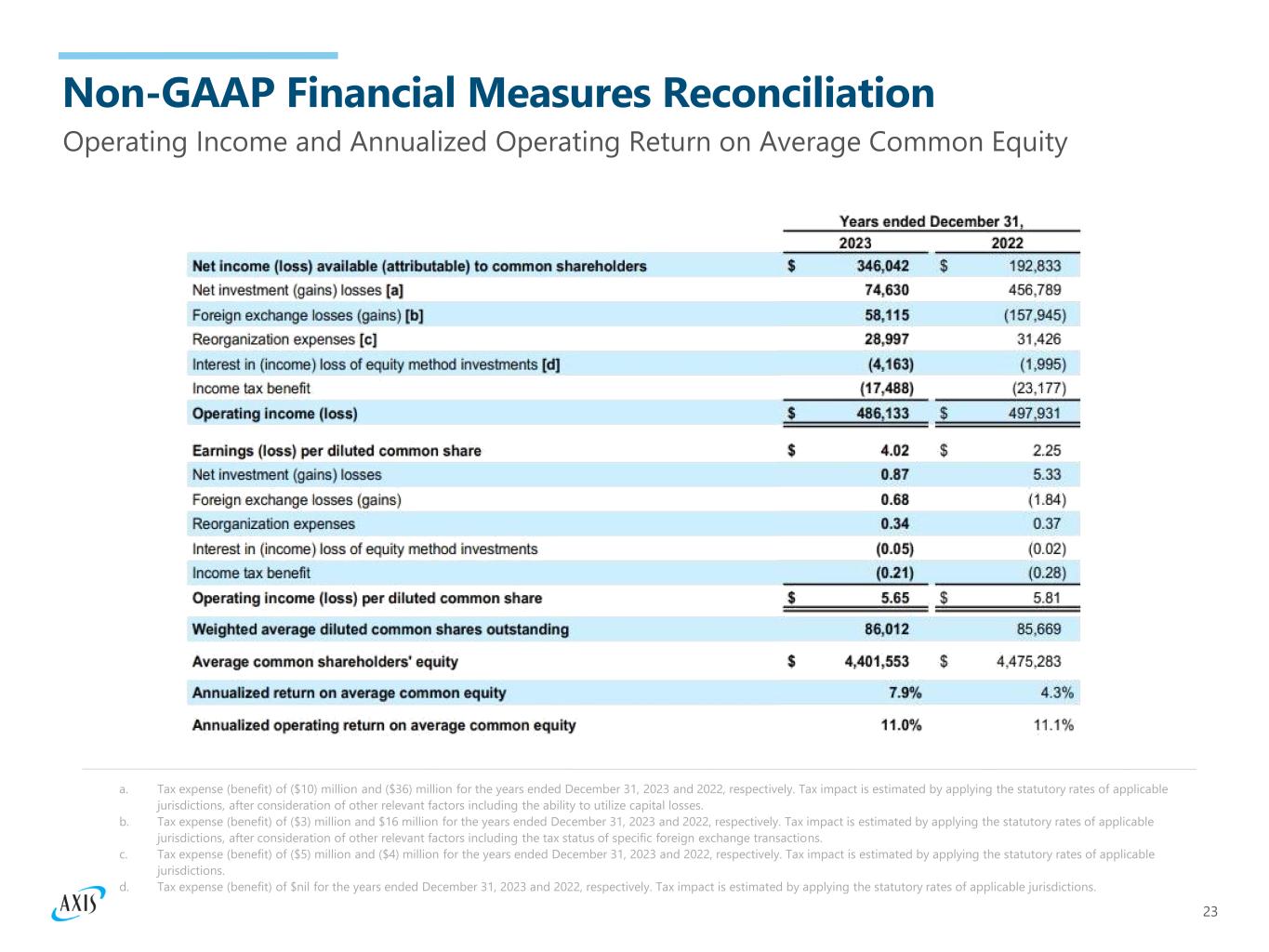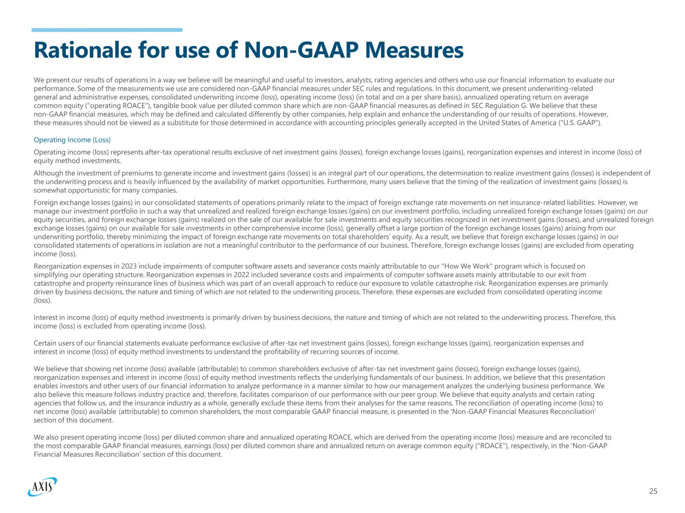 25 Rationale for use of Non-GAAP Measures We present our results of operations in a way we believe will be meaningful and useful to investors, analysts, rating agencies and others who use our financial information to evaluate our performance. Some of the measurements we use are considered non-GAAP financial measures under SEC rules and regulations. In this document, we present underwriting-related general and administrative expenses, consolidated underwriting income (loss), operating income (loss) (in total and on a per share basis), annualized operating return on average common equity ("operating ROACE"), tangible book value per diluted common share which are non-GAAP financial measures as defined in SEC Regulation G. We believe that these non-GAAP financial measures, which may be defined and calculated differently by other companies, help explain and enhance the understanding of our results of operations. However, these measures should not be viewed as a substitute for those determined in accordance with accounting principles generally accepted in the United States of America ("U.S. GAAP"). Operating Income (Loss) Operating income (loss) represents after-tax operational results exclusive of net investment gains (losses), foreign exchange losses (gains), reorganization expenses and interest in income (loss) of equity method investments. Although the investment of premiums to generate income and investment gains (losses) is an integral part of our operations, the determination to realize investment gains (losses) is independent of the underwriting process and is heavily influenced by the availability of market opportunities. Furthermore, many users believe that the timing of the realization of investment gains (losses) is somewhat opportunistic for many companies. Foreign exchange losses (gains) in our consolidated statements of operations primarily relate to the impact of foreign exchange rate movements on net insurance-related liabilities. However, we manage our investment portfolio in such a way that unrealized and realized foreign exchange losses (gains) on our investment portfolio, including unrealized foreign exchange losses (gains) on our equity securities, and foreign exchange losses (gains) realized on the sale of our available for sale investments and equity securities recognized in net investment gains (losses), and unrealized foreign exchange losses (gains) on our available for sale investments in other comprehensive income (loss), generally offset a large portion of the foreign exchange losses (gains) arising from our underwriting portfolio, thereby minimizing the impact of foreign exchange rate movements on total shareholders’ equity. As a result, we believe that foreign exchange losses (gains) in our consolidated statements of operations in isolation are not a meaningful contributor to the performance of our business. Therefore, foreign exchange losses (gains) are excluded from operating income (loss). Reorganization expenses in 2023 include impairments of computer software assets and severance costs mainly attributable to our "How We Work" program which is focused on simplifying our operating structure. Reorganization expenses in 2022 included severance costs and impairments of computer software assets mainly attributable to our exit from catastrophe and property reinsurance lines of business which was part of an overall approach to reduce our exposure to volatile catastrophe risk. Reorganization expenses are primarily driven by business decisions, the nature and timing of which are not related to the underwriting process. Therefore, these expenses are excluded from consolidated operating income (loss). Interest in income (loss) of equity method investments is primarily driven by business decisions, the nature and timing of which are not related to the underwriting process. Therefore, this income (loss) is excluded from operating income (loss). Certain users of our financial statements evaluate performance exclusive of after-tax net investment gains (losses), foreign exchange losses (gains), reorganization expenses and interest in income (loss) of equity method investments to understand the profitability of recurring sources of income. We believe that showing net income (loss) available (attributable) to common shareholders exclusive of after-tax net investment gains (losses), foreign exchange losses (gains), reorganization expenses and interest in income (loss) of equity method investments reflects the underlying fundamentals of our business. In addition, we believe that this presentation enables investors and other users of our financial information to analyze performance in a manner similar to how our management analyzes the underlying business performance. We also believe this measure follows industry practice and, therefore, facilitates comparison of our performance with our peer group. We believe that equity analysts and certain rating agencies that follow us, and the insurance industry as a whole, generally exclude these items from their analyses for the same reasons. The reconciliation of operating income (loss) to net income (loss) available (attributable) to common shareholders, the most comparable GAAP financial measure, is presented in the 'Non-GAAP Financial Measures Reconciliation' section of this document. We also present operating income (loss) per diluted common share and annualized operating ROACE, which are derived from the operating income (loss) measure and are reconciled to the most comparable GAAP financial measures, earnings (loss) per diluted common share and annualized return on average common equity ("ROACE"), respectively, in the 'Non-GAAP Financial Measures Reconciliation' section of this document.