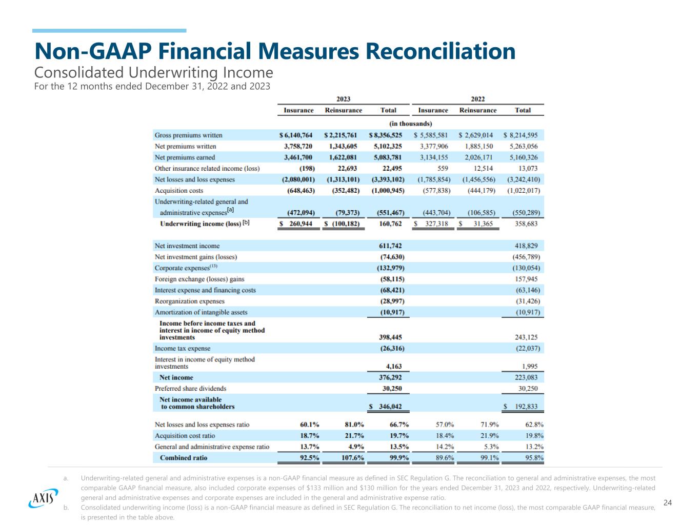 24 Non-GAAP Financial Measures Reconciliation Consolidated Underwriting Income For the 12 months ended December 31, 2022 and 2023 a. Underwriting-related general and administrative expenses is a non-GAAP financial measure as defined in SEC Regulation G. The reconciliation to general and administrative expenses, the most comparable GAAP financial measure, also included corporate expenses of $133 million and $130 million for the years ended December 31, 2023 and 2022, respectively. Underwriting-related general and administrative expenses and corporate expenses are included in the general and administrative expense ratio. b. Consolidated underwriting income (loss) is a non-GAAP financial measure as defined in SEC Regulation G. The reconciliation to net income (loss), the most comparable GAAP financial measure, is presented in the table above. [a] [b]