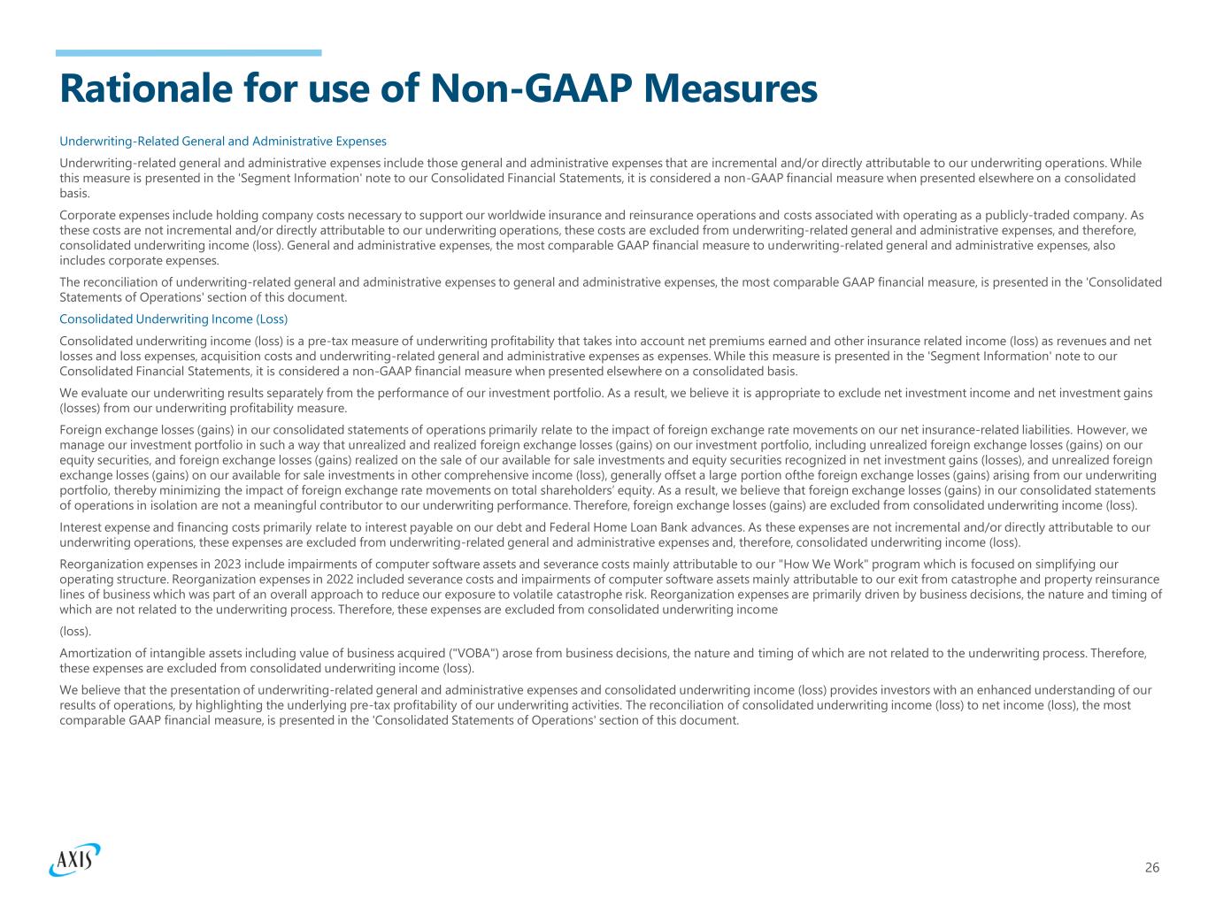 26 Rationale for use of Non-GAAP Measures Underwriting-Related General and Administrative Expenses Underwriting-related general and administrative expenses include those general and administrative expenses that are incremental and/or directly attributable to our underwriting operations. While this measure is presented in the 'Segment Information' note to our Consolidated Financial Statements, it is considered a non-GAAP financial measure when presented elsewhere on a consolidated basis. Corporate expenses include holding company costs necessary to support our worldwide insurance and reinsurance operations and costs associated with operating as a publicly-traded company. As these costs are not incremental and/or directly attributable to our underwriting operations, these costs are excluded from underwriting-related general and administrative expenses, and therefore, consolidated underwriting income (loss). General and administrative expenses, the most comparable GAAP financial measure to underwriting-related general and administrative expenses, also includes corporate expenses. The reconciliation of underwriting-related general and administrative expenses to general and administrative expenses, the most comparable GAAP financial measure, is presented in the 'Consolidated Statements of Operations' section of this document. Consolidated Underwriting Income (Loss) Consolidated underwriting income (loss) is a pre-tax measure of underwriting profitability that takes into account net premiums earned and other insurance related income (loss) as revenues and net losses and loss expenses, acquisition costs and underwriting-related general and administrative expenses as expenses. While this measure is presented in the 'Segment Information' note to our Consolidated Financial Statements, it is considered a non-GAAP financial measure when presented elsewhere on a consolidated basis. We evaluate our underwriting results separately from the performance of our investment portfolio. As a result, we believe it is appropriate to exclude net investment income and net investment gains (losses) from our underwriting profitability measure. Foreign exchange losses (gains) in our consolidated statements of operations primarily relate to the impact of foreign exchange rate movements on our net insurance-related liabilities. However, we manage our investment portfolio in such a way that unrealized and realized foreign exchange losses (gains) on our investment portfolio, including unrealized foreign exchange losses (gains) on our equity securities, and foreign exchange losses (gains) realized on the sale of our available for sale investments and equity securities recognized in net investment gains (losses), and unrealized foreign exchange losses (gains) on our available for sale investments in other comprehensive income (loss), generally offset a large portion ofthe foreign exchange losses (gains) arising from our underwriting portfolio, thereby minimizing the impact of foreign exchange rate movements on total shareholders’ equity. As a result, we believe that foreign exchange losses (gains) in our consolidated statements of operations in isolation are not a meaningful contributor to our underwriting performance. Therefore, foreign exchange losses (gains) are excluded from consolidated underwriting income (loss). Interest expense and financing costs primarily relate to interest payable on our debt and Federal Home Loan Bank advances. As these expenses are not incremental and/or directly attributable to our underwriting operations, these expenses are excluded from underwriting-related general and administrative expenses and, therefore, consolidated underwriting income (loss). Reorganization expenses in 2023 include impairments of computer software assets and severance costs mainly attributable to our "How We Work" program which is focused on simplifying our operating structure. Reorganization expenses in 2022 included severance costs and impairments of computer software assets mainly attributable to our exit from catastrophe and property reinsurance lines of business which was part of an overall approach to reduce our exposure to volatile catastrophe risk. Reorganization expenses are primarily driven by business decisions, the nature and timing of which are not related to the underwriting process. Therefore, these expenses are excluded from consolidated underwriting income (loss). Amortization of intangible assets including value of business acquired ("VOBA") arose from business decisions, the nature and timing of which are not related to the underwriting process. Therefore, these expenses are excluded from consolidated underwriting income (loss). We believe that the presentation of underwriting-related general and administrative expenses and consolidated underwriting income (loss) provides investors with an enhanced understanding of our results of operations, by highlighting the underlying pre-tax profitability of our underwriting activities. The reconciliation of consolidated underwriting income (loss) to net income (loss), the most comparable GAAP financial measure, is presented in the 'Consolidated Statements of Operations' section of this document.