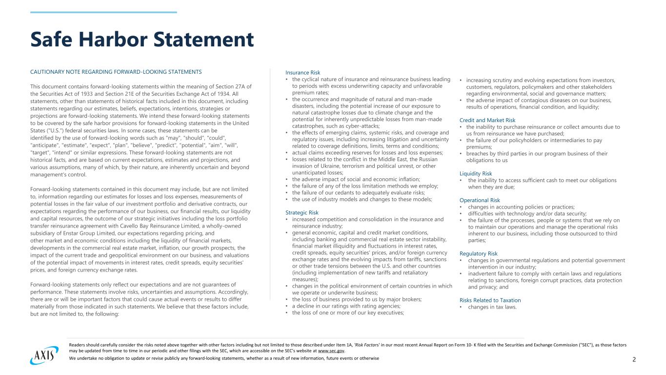 2 Safe Harbor Statement CAUTIONARY NOTE REGARDING FORWARD-LOOKING STATEMENTS This document contains forward-looking statements within the meaning of Section 27A of the Securities Act of 1933 and Section 21E of the Securities Exchange Act of 1934. All statements, other than statements of historical facts included in this document, including statements regarding our estimates, beliefs, expectations, intentions, strategies or projections are forward-looking statements. We intend these forward-looking statements to be covered by the safe harbor provisions for forward-looking statements in the United States ("U.S.") federal securities laws. In some cases, these statements can be identified by the use of forward-looking words such as "may", "should", "could", "anticipate", "estimate", "expect", "plan", "believe", "predict", "potential", "aim", "will", "target", "intend" or similar expressions. These forward-looking statements are not historical facts, and are based on current expectations, estimates and projections, and various assumptions, many of which, by their nature, are inherently uncertain and beyond management's control. Forward-looking statements contained in this document may include, but are not limited to, information regarding our estimates for losses and loss expenses, measurements of potential losses in the fair value of our investment portfolio and derivative contracts, our expectations regarding the performance of our business, our financial results, our liquidity and capital resources, the outcome of our strategic initiatives including the loss portfolio transfer reinsurance agreement with Cavello Bay Reinsurance Limited, a wholly-owned subsidiary of Enstar Group Limited, our expectations regarding pricing, and other market and economic conditions including the liquidity of financial markets, developments in the commercial real estate market, inflation, our growth prospects, the impact of the current trade and geopolitical environment on our business, and valuations of the potential impact of movements in interest rates, credit spreads, equity securities' prices, and foreign currency exchange rates. Forward-looking statements only reflect our expectations and are not guarantees of performance. These statements involve risks, uncertainties and assumptions. Accordingly, there are or will be important factors that could cause actual events or results to differ materially from those indicated in such statements. We believe that these factors include, but are not limited to, the following: Insurance Risk • the cyclical nature of insurance and reinsurance business leading to periods with excess underwriting capacity and unfavorable premium rates; • the occurrence and magnitude of natural and man-made disasters, including the potential increase of our exposure to natural catastrophe losses due to climate change and the potential for inherently unpredictable losses from man-made catastrophes, such as cyber-attacks; • the effects of emerging claims, systemic risks, and coverage and regulatory issues, including increasing litigation and uncertainty related to coverage definitions, limits, terms and conditions; • actual claims exceeding reserves for losses and loss expenses; • losses related to the conflict in the Middle East, the Russian invasion of Ukraine, terrorism and political unrest, or other unanticipated losses; • the adverse impact of social and economic inflation; • the failure of any of the loss limitation methods we employ; • the failure of our cedants to adequately evaluate risks; • the use of industry models and changes to these models; Strategic Risk • increased competition and consolidation in the insurance and reinsurance industry; • general economic, capital and credit market conditions, including banking and commercial real estate sector instability, financial market illiquidity and fluctuations in interest rates, credit spreads, equity securities' prices, and/or foreign currency exchange rates and the evolving impacts from tariffs, sanctions or other trade tensions between the U.S. and other countries (including implementation of new tariffs and retaliatory measures); • changes in the political environment of certain countries in which we operate or underwrite business; • the loss of business provided to us by major brokers; • a decline in our ratings with rating agencies; • the loss of one or more of our key executives; • increasing scrutiny and evolving expectations from investors, customers, regulators, policymakers and other stakeholders regarding environmental, social and governance matters; • the adverse impact of contagious diseases on our business, results of operations, financial condition, and liquidity; Credit and Market Risk • the inability to purchase reinsurance or collect amounts due to us from reinsurance we have purchased; • the failure of our policyholders or intermediaries to pay premiums; • breaches by third parties in our program business of their obligations to us Liquidity Risk • the inability to access sufficient cash to meet our obligations when they are due; Operational Risk • changes in accounting policies or practices; • difficulties with technology and/or data security; • the failure of the processes, people or systems that we rely on to maintain our operations and manage the operational risks inherent to our business, including those outsourced to third parties; Regulatory Risk • changes in governmental regulations and potential government intervention in our industry; • inadvertent failure to comply with certain laws and regulations relating to sanctions, foreign corrupt practices, data protection and privacy; and Risks Related to Taxation • changes in tax laws. Readers should carefully consider the risks noted above together with other factors including but not limited to those described under Item 1A, 'Risk Factors' in our most recent Annual Report on Form 10- K filed with the Sec