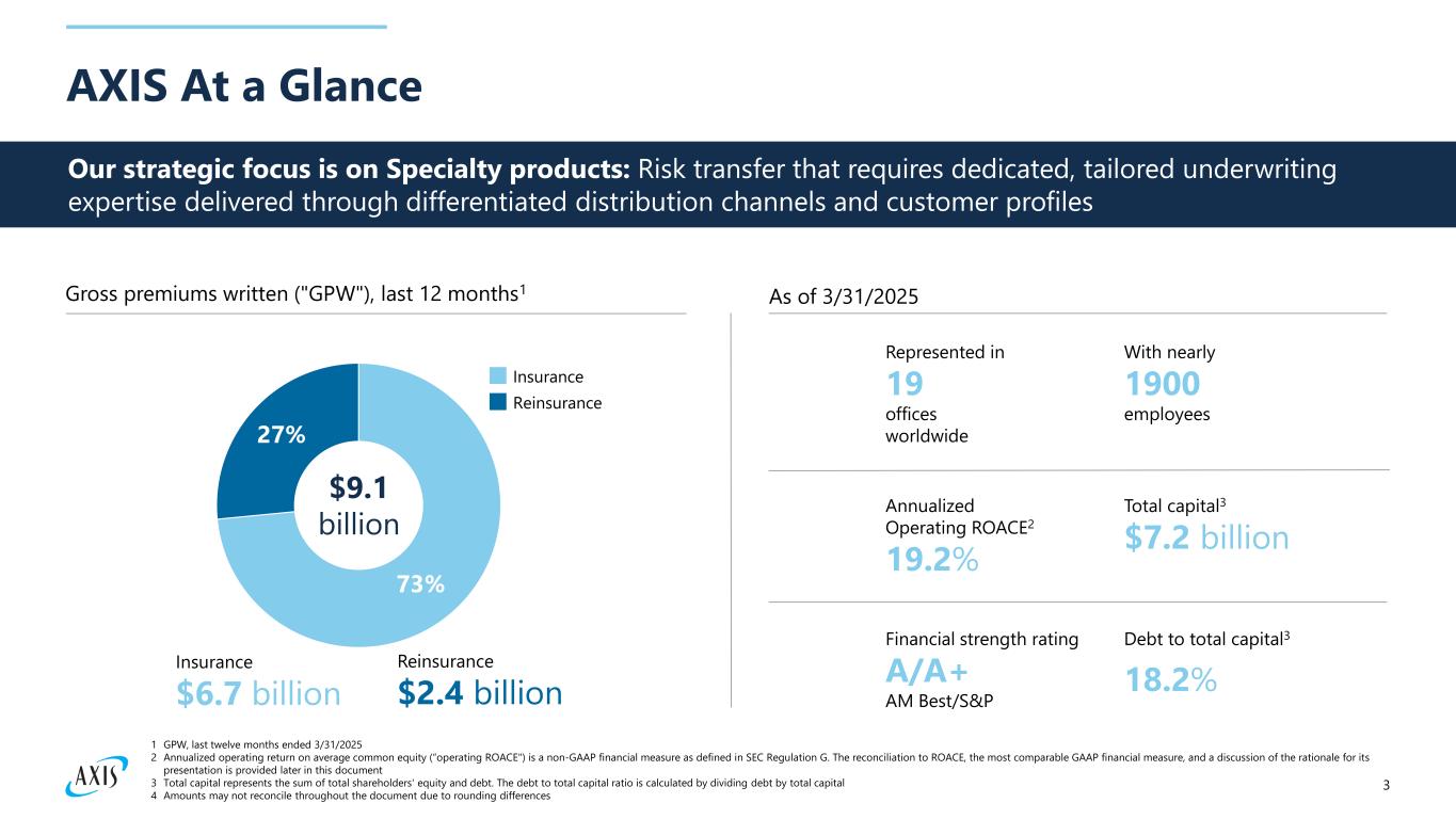 2 Safe Harbor Statement CAUTIONARY NOTE REGARDING FORWARD-LOOKING STATEMENTS This document contains forward-looking statements within the meaning of Section 27A of the Securities Act of 1933 and Section 21E of the Securities Exchange Act of 1934. All statements, other than statements of historical facts included in this document, including statements regarding our estimates, beliefs, expectations, intentions, strategies or projections are forward-looking statements. We intend these forward-looking statements to be covered by the safe harbor provisions for forward-looking statements in the United States ("U.S.") federal securities laws. In some cases, these statements can be identified by the use of forward-looking words such as "may", "should", "could", "anticipate", "estimate", "expect", "plan", "believe", "predict", "potential", "aim", "will", "target", "intend" or similar expressions. These forward-looking statements are not historical facts, and are based on current expectations, estimates and projections, and various assumptions, many of which, by their nature, are inherently uncertain and beyond management's control. Forward-looking statements contained in this document may include, but are not limited to, information regarding our estimates for losses and loss expenses, measurements of potential losses in the fair value of our investment portfolio and derivative contracts, our expectations regarding the performance of our business, our financial results, our liquidity and capital resources, the outcome of our strategic initiatives including the loss portfolio transfer reinsurance agreement with Cavello Bay Reinsurance Limited, a wholly-owned subsidiary of Enstar Group Limited, our expectations regarding pricing, and other market and economic conditions including the liquidity of financial markets, developments in the commercial real estate market, inflation, our growth prospects, the impact of the current trade and geopolitical environment on our business, and valuations of the potential impact of movements in interest rates, credit spreads, equity securities' prices, and foreign currency exchange rates. Forward-looking statements only reflect our expectations and are not guarantees of performance. These statements involve risks, uncertainties and assumptions. Accordingly, there are or will be important factors that could cause actual events or results to differ materially from those indicated in such statements. We believe that these factors include, but are not limited to, the following: Insurance Risk • the cyclical nature of insurance and reinsurance business leading to periods with excess underwriting capacity and unfavorable premium rates; • the occurrence and magnitude of natural and man-made disasters, including the potential increase of our exposure to natural catastrophe losses due to climate change and the potential for inherently unpredictable losses from man-made catastrophes, such as cyber-attacks; • the effects of emerging claims, systemic risks, and coverage and regulatory issues, including increasing litigation and uncertainty related to coverage definitions, limits, terms and conditions; • actual claims exceeding reserves for losses and loss expenses; • losses related to the conflict in the Middle East, the Russian invasion of Ukraine, terrorism and political unrest, or other unanticipated losses; • the adverse impact of social and economic inflation; • the failure of any of the loss limitation methods we employ; • the failure of our cedants to adequately evaluate risks; • the use of industry models and changes to these models; Strategic Risk • increased competition and consolidation in the insurance and reinsurance industry; • general economic, capital and credit market conditions, including banking and commercial real estate sector instability, financial market illiquidity and fluctuations in interest rates, credit spreads, equity securities' prices, and/or foreign currency exchange rates and the evolving impacts from tariffs, sanctions or other trade tensions between the U.S. and other countries (including implementation of new tariffs and retaliatory measures); • changes in the political environment of certain countries in which we operate or underwrite business; • the loss of business provided to us by major brokers; • a decline in our ratings with rating agencies; • the loss of one or more of our key executives; • increasing scrutiny and evolving expectations from investors, customers, regulators, policymakers and other stakeholders regarding environmental, social and governance matters; • the adverse impact of contagious diseases on our business, results of operations, financial condition, and liquidity; Credit and Market Risk • the inability to purchase reinsurance or collect amounts due to us from reinsurance we have purchased; • the failure of our policyholders or intermediaries to pay premiums; • breaches by third parties in our program business of their obligations to us Liquidity Risk • the inability to access sufficient cash to meet our obligations when they are due; Operational Risk • changes in accounting policies or practices; • difficulties with technology and/or data security; • the failure of the processes, people or systems that we rely on to maintain our operations and manage the operational risks inherent to our business, including those outsourced to third parties; Regulatory Risk • changes in governmental regulations and potential government intervention in our industry; • inadvertent failure to comply with certain laws and regulations relating to sanctions, foreign corrupt practices, data protection and privacy; and Risks Related to Taxation • changes in tax laws. Readers should carefully consider the risks noted above together with other factors including but not limited to those described under Item 1A, 'Risk Factors' in our most recent Annual Report on Form 10- K filed with the Sec