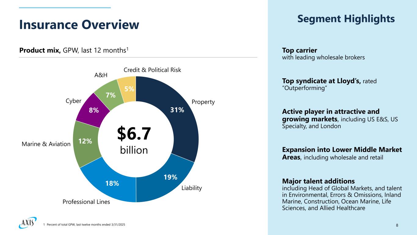 7 Broad, diverse Specialty portfolio ​ 23% Property 21% Professional Lines Cyber2 18% Liability 10% Marine & Aviation 9%Accident & Health 9% Other3 6%Credit, Surety & Political Risk 4% $9.1 billion Product mix, GPW, last 12 months1 Insurance Reinsurance Includes business written out of North America, primarily in Excess and Surplus, and Wholesale, Financial Lines, Programs, and multiline products for the Canadian markets Also includes Global Markets, our London- based international business, which offers a diverse portfolio of Specialty products including Marine & Aviation, Property, Cyber, and Renewable Energy4 Focus on Casualty, Accident & Health, Credit & Surety, and other Specialty business Complementary and accretive to our Specialty insurance book 1 Percent of total GPW, last twelve months ended 3/31/2025 2 Includes Cyber insurance only. Cyber reinsurance is included in Professional Lines 3 Includes Agriculture reinsurance, Motor reinsurance, and Run-off lines. 4 Renewable energy is included in Property and Marine & Aviation.