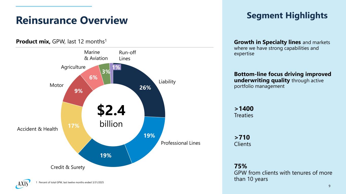 8 Insurance Overview ​ 31% Property 19% Professional Lines Cyber 18% Liability 12%Marine & Aviation 8% Credit & Political Risk 7% A&H 5% $6.7 billion Product mix, GPW, last 12 months1 1 Percent of total GPW, last twelve months ended 3/31/2025 Top carrier with leading wholesale brokers Top syndicate at Lloyd’s, rated “Outperforming” Active player in attractive and growing markets, including US E&S, US Specialty, and London Expansion into Lower Middle Market Areas, including wholesale and retail Major talent additions including Head of Global Markets, and talent in Environmental, Errors & Omissions, Inland Marine, Construction, Ocean Marine, Life Sciences, and Allied Healthcare Segment Highlights