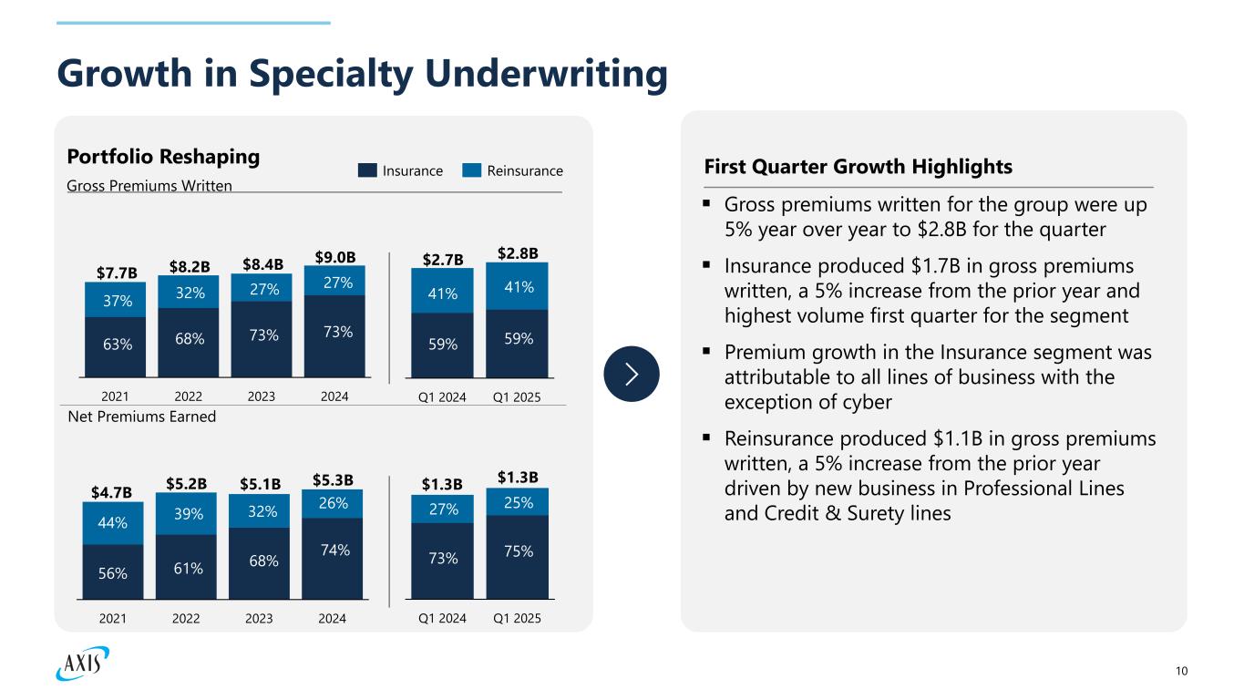 9 Reinsurance Overview ​ 26% 19% Credit & Surety Motor 19% Liability 17% Professional Lines 9% Run-off Lines 6% Agriculture 3% $2.4 billion Product mix, GPW, last 12 months1 1 Percent of total GPW, last twelve months ended 3/31/2025 Accident & Health Marine & Aviation 1% Segment Highlights Growth in Specialty lines and markets where we have strong capabilities and expertise Bottom-line focus driving improved underwriting quality through active portfolio management >1400 Treaties >710 Clients 75% GPW from clients with tenures of more than 10 years