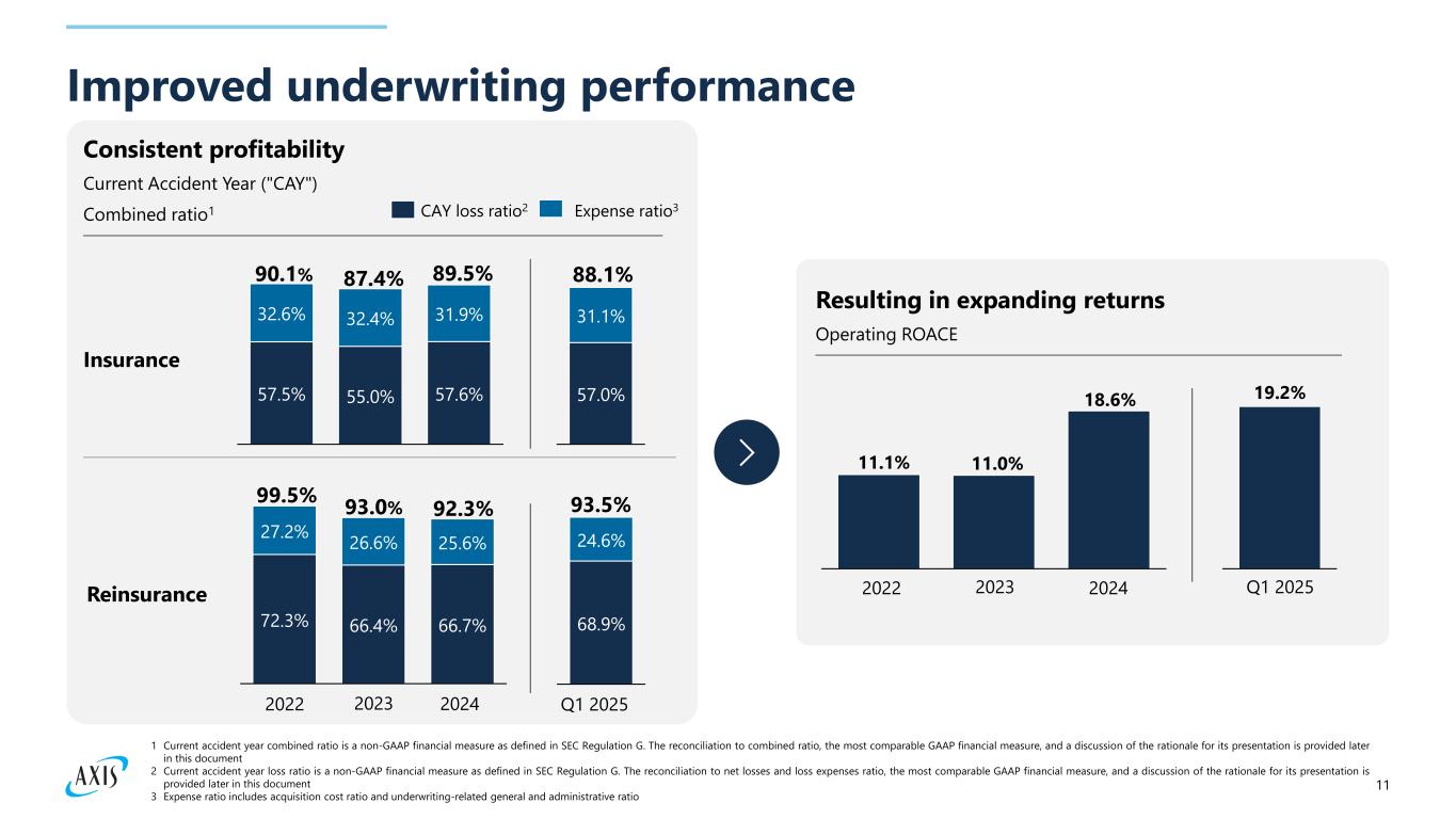 10 Portfolio Reshaping Gross Premiums Written Growth in Specialty Underwriting ReinsuranceInsurance First Quarter Growth Highlights ▪ Gross premiums written for the group were up 5% year over year to $2.8B for the quarter ▪ Insurance produced $1.7B in gross premiums written, a 5% increase from the prior year and highest volume first quarter for the segment ▪ Premium growth in the Insurance segment was attributable to all lines of business with the exception of cyber ▪ Reinsurance produced $1.1B in gross premiums written, a 5% increase from the prior year driven by new business in Professional Lines and Credit & Surety lines Net Premiums Earned 2021 2022 2023 2024 32% 68% 27% 73% 27% 73% 37% 63% $7.7B $8.2B $8.4B $9.0B Q1 2024 Q1 2025 41% 41% 59% 59% $2.7B $2.8B 2021 2022 2023 2024 61% 68% 74% 44% 39% 32% 26% $4.7B $5.2B $5.1B $5.3B 56% Q1 2024 Q1 2025 $1.3B $1.3B 27% 25% 73% 75%