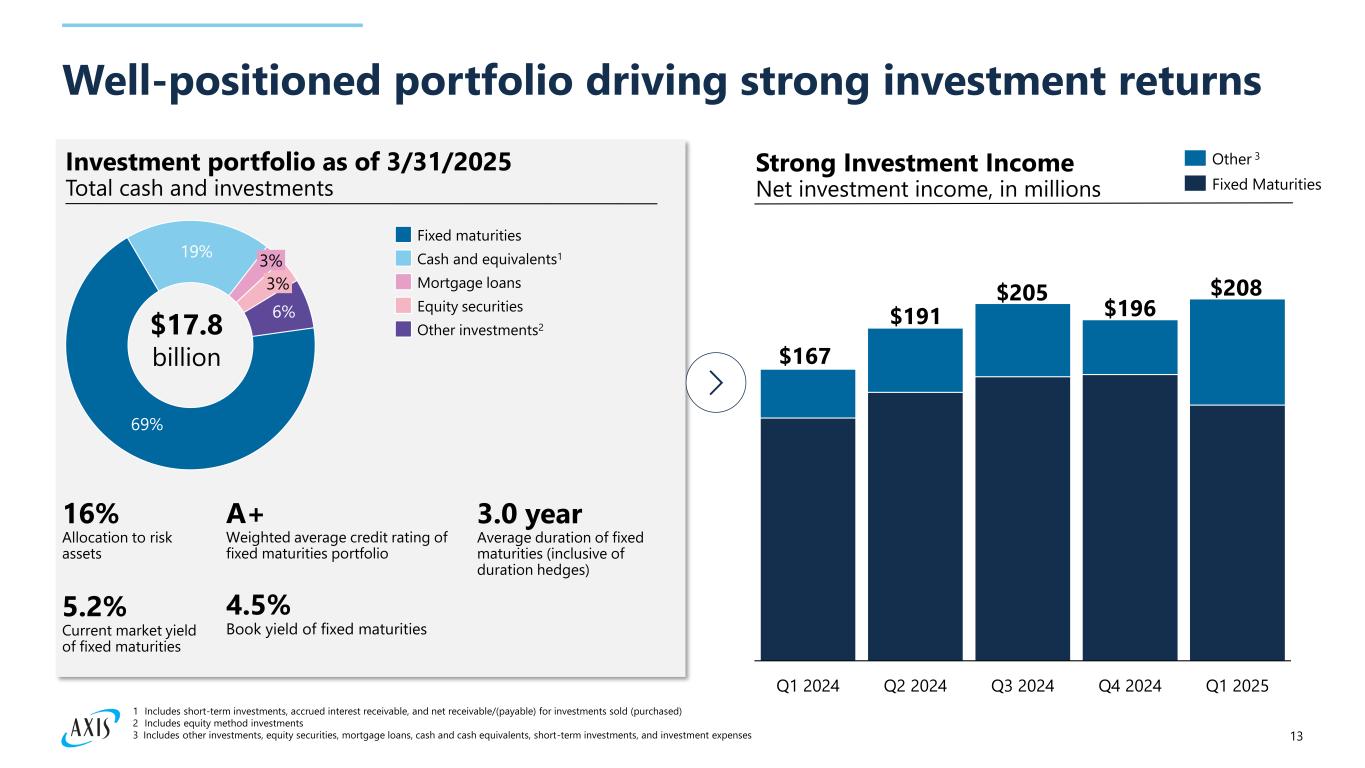 11 18.6% 11.1% 72.3% 66.4% 66.7% 27.2% 26.6% 25.6% 57.5% 55.0% 57.6% 32.6% 32.4% 31.9% Consistent profitability Current Accident Year ("CAY") Combined ratio1 Improved underwriting performance CAY loss ratio2 Expense ratio3 Insurance Reinsurance 2022 Resulting in expanding returns Operating ROACE 1 Current accident year combined ratio is a non-GAAP financial measure as defined in SEC Regulation G. The reconciliation to combined ratio, the most comparable GAAP financial measure, and a discussion of the rationale for its presentation is provided later in this document 2 Current accident year loss ratio is a non-GAAP financial measure as defined in SEC Regulation G. The reconciliation to net losses and loss expenses ratio, the most comparable GAAP financial measure, and a discussion of the rationale for its presentation is provided later in this document 3 Expense ratio includes acquisition cost ratio and underwriting-related general and administrative ratio 2024 11.0% 2022 2024 90.1% 87.4% 89.5% 99.5% 92.3%93.0% 2023 2023 57.0% 31.1% 88.1% 68.9% 24.6% Q1 2025 93.5% 19.2% Q1 2025