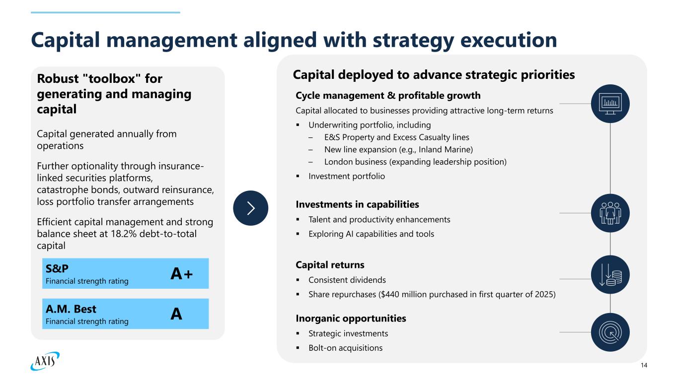 13 Q1 2024 Q2 2024 Q3 2024 Q4 2024 Q1 2025 $167 $191 $205 $196 $208 Well-positioned portfolio driving strong investment returns 69% 3% 3% Investment portfolio as of 3/31/2025 Total cash and investments $17.8 billion Fixed maturities Cash and equivalents1 Mortgage loans Equity securities Other investments2 A+ Weighted average credit rating of fixed maturities portfolio 3.0 year Average duration of fixed maturities (inclusive of duration hedges) 5.2% Current market yield of fixed maturities 4.5% Book yield of fixed maturities 16% Allocation to risk assets 1 Includes short-term investments, accrued interest receivable, and net receivable/(payable) for investments sold (purchased) 2 Includes equity method investments 3 Includes other investments, equity securities, mortgage loans, cash and cash equivalents, short-term investments, and investment expenses 19% 6% Strong Investment Income Net investment income, in millions Other 3 Fixed Maturities