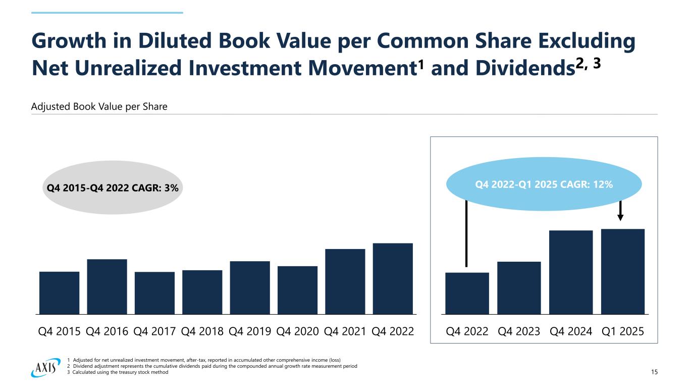 14 Capital management aligned with strategy execution Robust "toolbox" for generating and managing capital Capital generated annually from operations Further optionality through insurance- linked securities platforms, catastrophe bonds, outward reinsurance, loss portfolio transfer arrangements Efficient capital management and strong balance sheet at 18.2% debt-to-total capital S&P Financial strength rating A+ A.M. Best Financial strength rating A Capital deployed to advance strategic priorities Cycle management & profitable growth Capital allocated to businesses providing attractive long-term returns ▪ Underwriting portfolio, including – E&S Property and Excess Casualty lines – New line expansion (e.g., Inland Marine) – London business (expanding leadership position) ▪ Investment portfolio Investments in capabilities ▪ Talent and productivity enhancements ▪ Exploring AI capabilities and tools Capital returns ▪ Consistent dividends ▪ Share repurchases ($440 million purchased in first quarter of 2025) Inorganic opportunities ▪ Strategic investments ▪ Bolt-on acquisitions