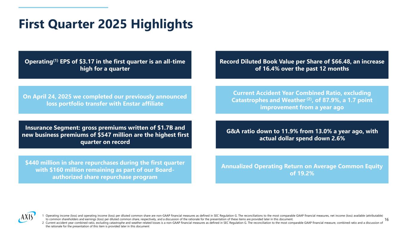 15 Q4 2022 Q4 2023 Q4 2024 Q1 2025Q4 2015 Q4 2016 Q4 2017 Q4 2018 Q4 2019 Q4 2020 Q4 2021 Q4 2022 Growth in Diluted Book Value per Common Share Excluding Net Unrealized Investment Movement1 and Dividends2, 3 Q4 2015-Q4 2022 CAGR: 3% 1 Adjusted for net unrealized investment movement, after-tax, reported in accumulated other comprehensive income (loss) 2 Dividend adjustment represents the cumulative dividends paid during the compounded annual growth rate measurement period 3 Calculated using the treasury stock method Q4 2022-Q1 2025 CAGR: 12% Adjusted Book Value per Share