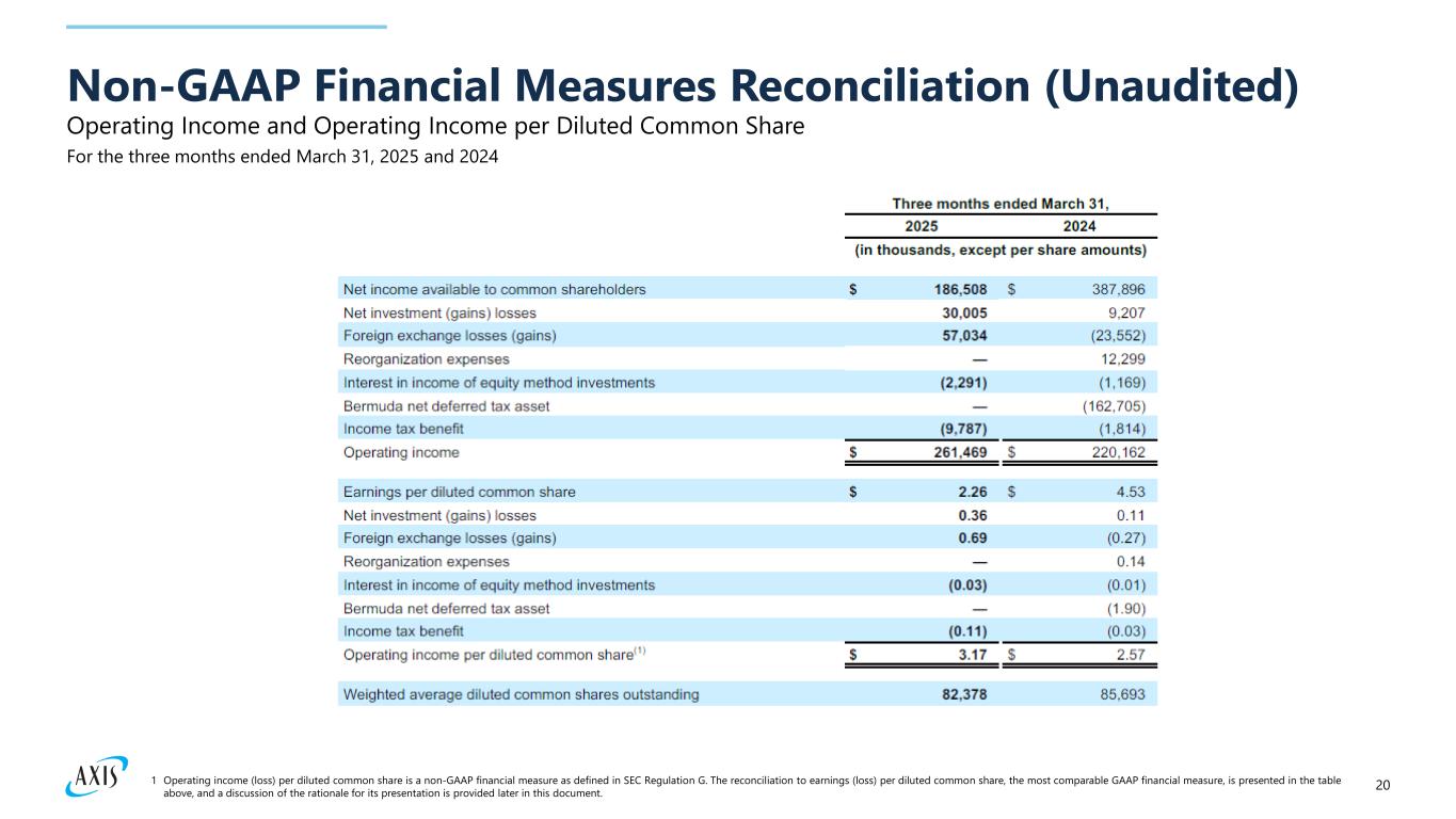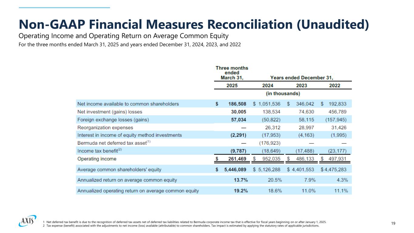 191 Net deferred tax benefit is due to the recognition of deferred tax assets net of deferred tax liabilities related to Bermuda corporate income tax that is effective for fiscal years beginning on or after January 1, 2025. 2 Tax expense (benefit) associated with the adjustments to net income (loss) available (attributable) to common shareholders. Tax impact is estimated by applying the statutory rates of applicable jurisdictions. Operating Income and Operating Return on Average Common Equity Non-GAAP Financial Measures Reconciliation (Unaudited) For the three months ended March 31, 2025 and years ended December 31, 2024, 2023, and 2022