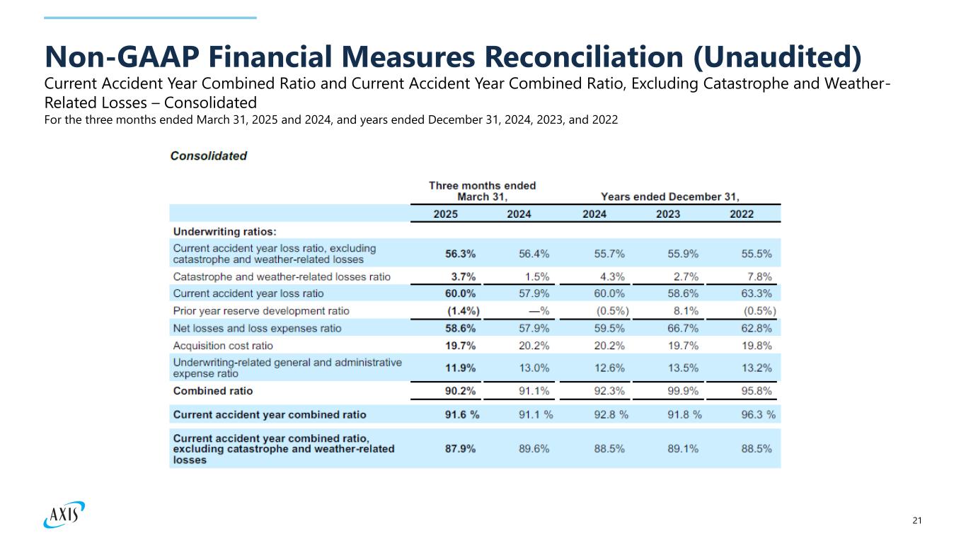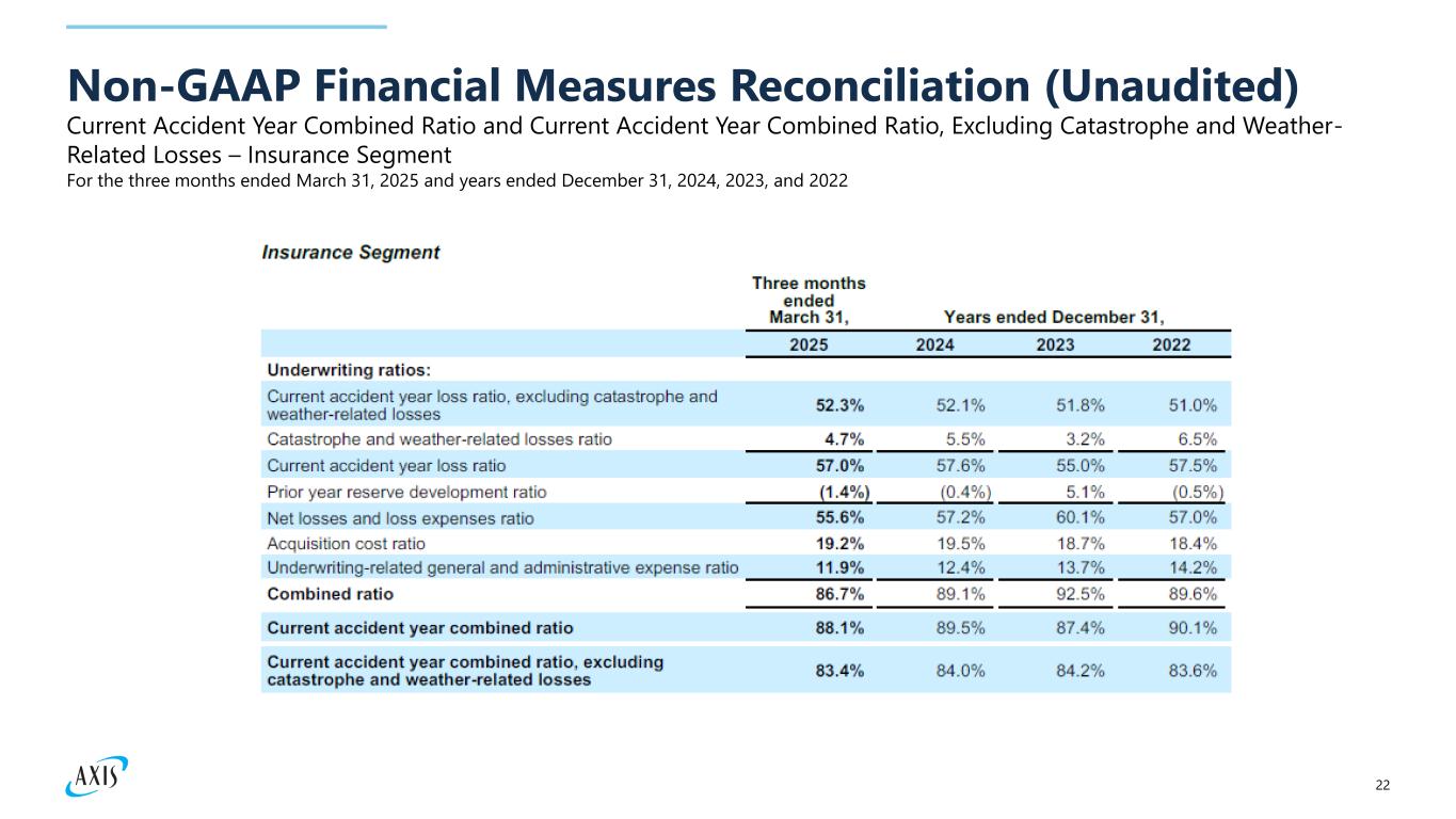 21 Current Accident Year Combined Ratio and Current Accident Year Combined Ratio, Excluding Catastrophe and Weather- Related Losses – Consolidated Non-GAAP Financial Measures Reconciliation (Unaudited) For the three months ended March 31, 2025 and 2024, and years ended December 31, 2024, 2023, and 2022