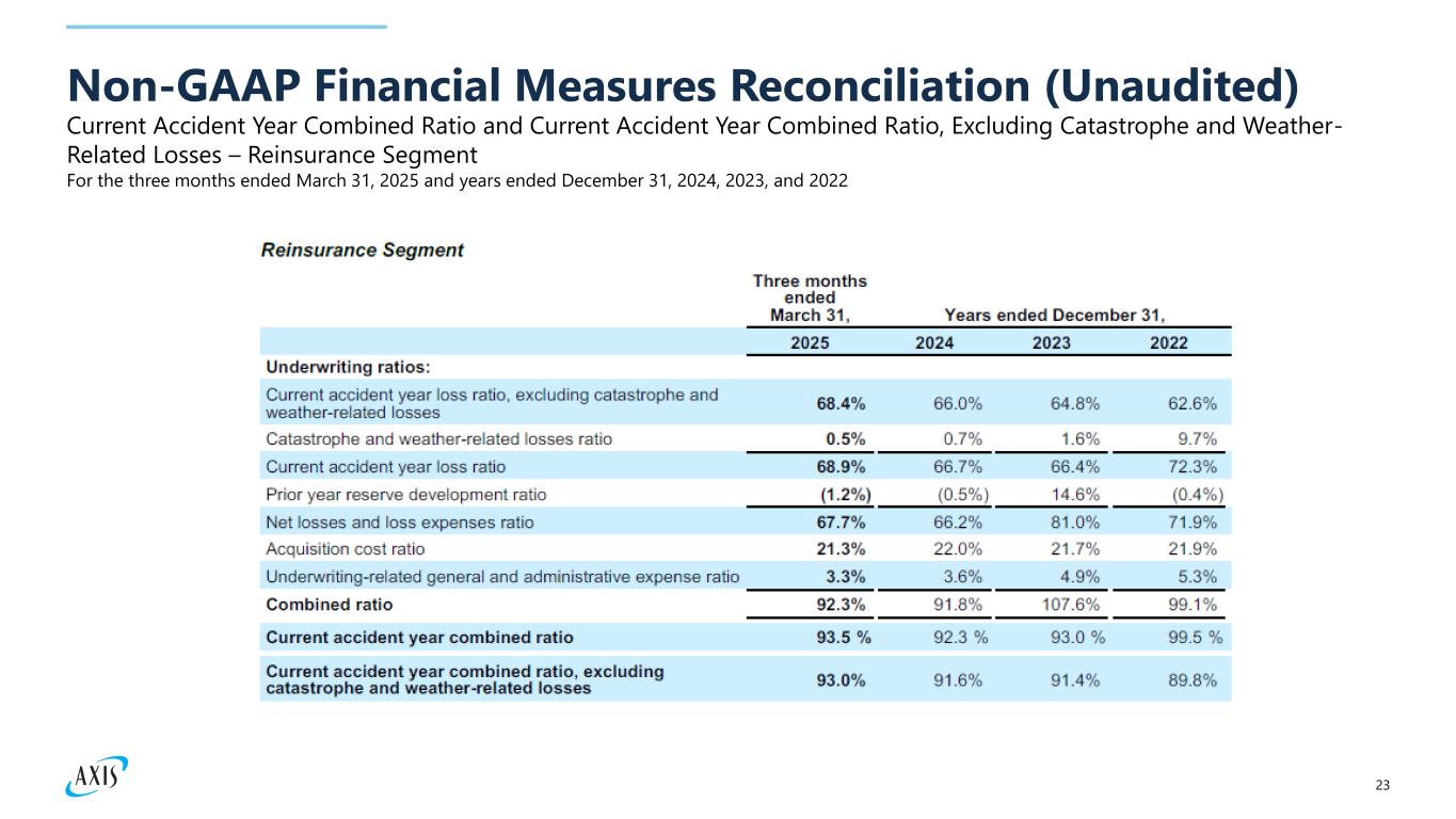 22 Current Accident Year Combined Ratio and Current Accident Year Combined Ratio, Excluding Catastrophe and Weather- Related Losses – Insurance Segment Non-GAAP Financial Measures Reconciliation (Unaudited) For the three months ended March 31, 2025 and years ended December 31, 2024, 2023, and 2022
