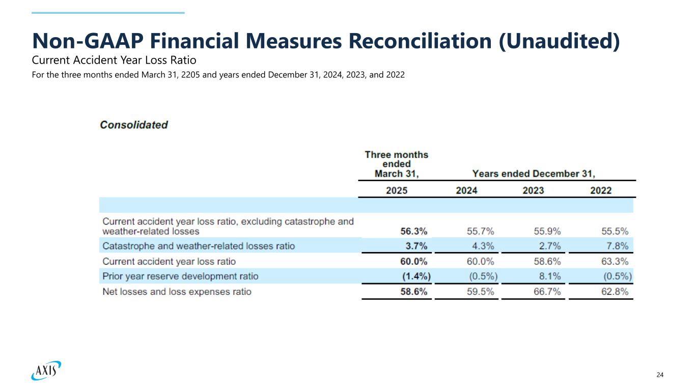 24 Current Accident Year Loss Ratio Non-GAAP Financial Measures Reconciliation (Unaudited) For the three months ended March 31, 2205 and years ended December 31, 2024, 2023, and 2022