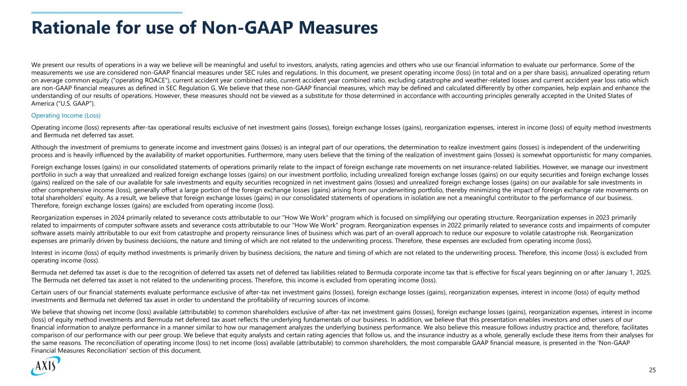 25 Rationale for use of Non-GAAP Measures We present our results of operations in a way we believe will be meaningful and useful to investors, analysts, rating agencies and others who use our financial information to evaluate our performance. Some of the measurements we use are considered non-GAAP financial measures under SEC rules and regulations. In this document, we present operating income (loss) (in total and on a per share basis), annualized operating return on average common equity ("operating ROACE"), current accident year combined ratio, current accident year combined ratio, excluding catastrophe and weather-related losses and current accident year loss ratio which are non-GAAP financial measures as defined in SEC Regulation G. We believe that these non-GAAP financial measures, which may be defined and calculated differently by other companies, help explain and enhance the understanding of our results of operations. However, these measures should not be viewed as a substitute for those determined in accordance with accounting principles generally accepted in the United States of America ("U.S. GAAP"). Operating Income (Loss) Operating income (loss) represents after-tax operational results exclusive of net investment gains (losses), foreign exchange losses (gains), reorganization expenses, interest in income (loss) of equity method investments and Bermuda net deferred tax asset. Although the investment of premiums to generate income and investment gains (losses) is an integral part of our operations, the determination to realize investment gains (losses) is independent of the underwriting process and is heavily influenced by the availability of market opportunities. Furthermore, many users believe that the timing of the realization of investment gains (losses) is somewhat opportunistic for many companies. Foreign exchange losses (gains) in our consolidated statements of operations primarily relate to the impact of foreign exchange rate movements on net insurance-related liabilities. However, we manage our investment portfolio in such a way that unrealized and realized foreign exchange losses (gains) on our investment portfolio, including unrealized foreign exchange losses (gains) on our equity securities and foreign exchange losses (gains) realized on the sale of our available for sale investments and equity securities recognized in net investment gains (losses) and unrealized foreign exchange losses (gains) on our available for sale investments in other comprehensive income (loss), generally offset a large portion of the foreign exchange losses (gains) arising from our underwriting portfolio, thereby minimizing the impact of foreign exchange rate movements on total shareholders' equity. As a result, we believe that foreign exchange losses (gains) in our consolidated statements of operations in isolation are not a meaningful contributor to the performance of our business. Therefore, foreign exchange losses (gains) are excluded from operating income (loss). Reorganization expenses in 2024 primarily related to severance costs attributable to our "How We Work" program which is focused on simplifying our operating structure. Reorganization expenses in 2023 primarily related to impairments of computer software assets and severance costs attributable to our "How We Work" program. Reorganization expenses in 2022 primarily related to severance costs and impairments of computer software assets mainly attributable to our exit from catastrophe and property reinsurance lines of business which was part of an overall approach to reduce our exposure to volatile catastrophe risk. Reorganization expenses are primarily driven by business decisions, the nature and timing of which are not related to the underwriting process. Therefore, these expenses are excluded from operating income (loss). Interest in income (loss) of equity method investments is primarily driven by business decisions, the nature and timing of which are not related to the underwriting process. Therefore, this income (loss) is excluded from operating income (loss). Bermuda net deferred tax asset is due to the recognition of deferred tax assets net of deferred tax liabilities related to Bermuda corporate income tax that is effective for fiscal years beginning on or after January 1, 2025. The Bermuda net deferred tax asset is not related to the underwriting process. Therefore, this income is excluded from operating income (loss). Certain users of our financial statements evaluate performance exclusive of after-tax net investment gains (losses), foreign exchange losses (gains), reorganization expenses, interest in income (loss) of equity method investments and Bermuda net deferred tax asset in order to understand the profitability of recurring sources of income. We believe that showing net income (loss) available (attributable) to common shareholders exclusive of after-tax net investment gains (losses), foreign exchange losses (gains), reorganization expenses, interest in income (loss) of equity method investments and Bermuda net deferred tax asset reflects the underlying fundamentals of our business. In addition, we believe that this presentation enables investors and other users of our financial information to analyze performance in a manner similar to how our management analyzes the underlying business performance. We also believe this measure follows industry practice and, therefore, facilitates comparison of our performance with our peer group. We believe that equity analysts and certain rating agencies that follow us, and the insurance industry as a whole, generally exclude these items from their analyses for the same reasons. The reconciliation of operating income (loss) to net income (loss) available (attributable) to common shareholders, the most comparable GAAP financial measure, is presented in the 'Non-GAAP Financial Measures Reconciliation' section of this document.