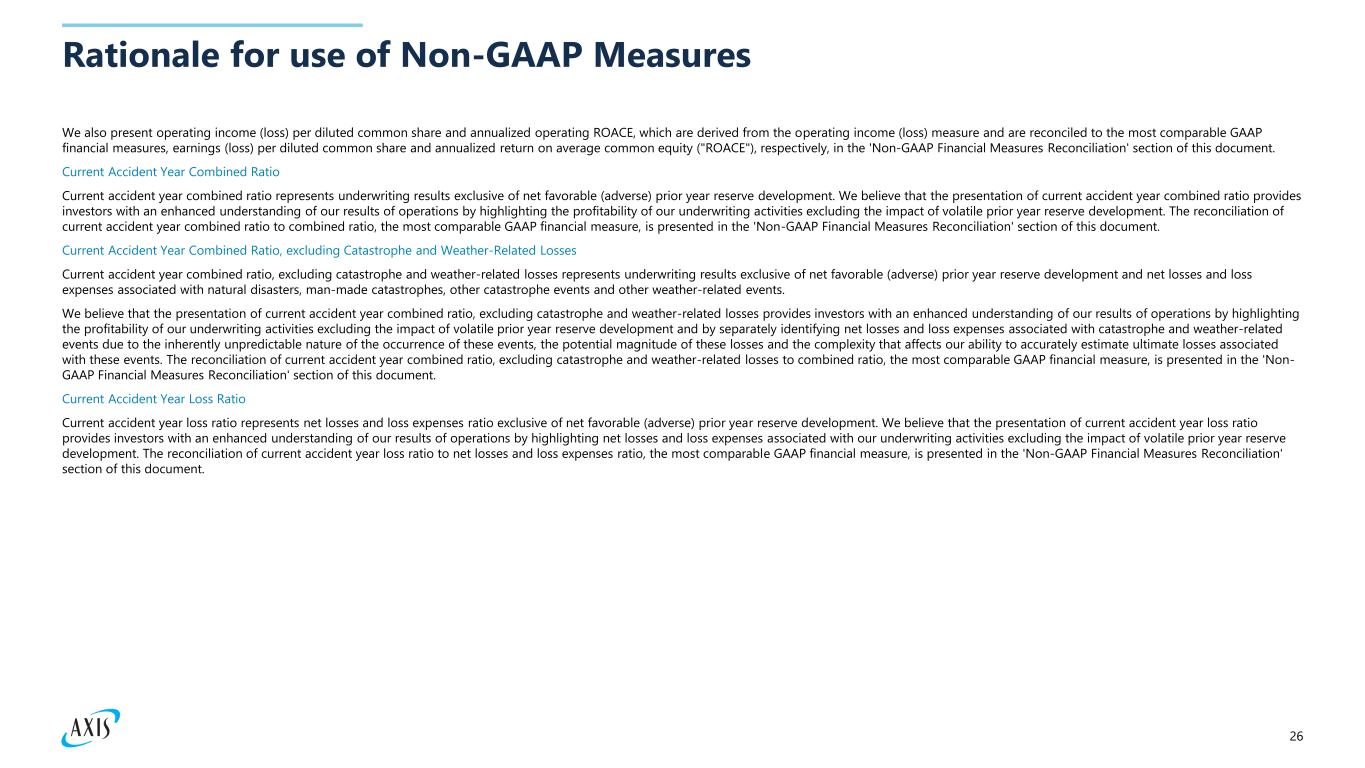 26 Rationale for use of Non-GAAP Measures We also present operating income (loss) per diluted common share and annualized operating ROACE, which are derived from the operating income (loss) measure and are reconciled to the most comparable GAAP financial measures, earnings (loss) per diluted common share and annualized return on average common equity ("ROACE"), respectively, in the 'Non-GAAP Financial Measures Reconciliation' section of this document. Current Accident Year Combined Ratio Current accident year combined ratio represents underwriting results exclusive of net favorable (adverse) prior year reserve development. We believe that the presentation of current accident year combined ratio provides investors with an enhanced understanding of our results of operations by highlighting the profitability of our underwriting activities excluding the impact of volatile prior year reserve development. The reconciliation of current accident year combined ratio to combined ratio, the most comparable GAAP financial measure, is presented in the 'Non-GAAP Financial Measures Reconciliation' section of this document. Current Accident Year Combined Ratio, excluding Catastrophe and Weather-Related Losses Current accident year combined ratio, excluding catastrophe and weather-related losses represents underwriting results exclusive of net favorable (adverse) prior year reserve development and net losses and loss expenses associated with natural disasters, man-made catastrophes, other catastrophe events and other weather-related events. We believe that the presentation of current accident year combined ratio, excluding catastrophe and weather-related losses provides investors with an enhanced understanding of our results of operations by highlighting the profitability of our underwriting activities excluding the impact of volatile prior year reserve development and by separately identifying net losses and loss expenses associated with catastrophe and weather-related events due to the inherently unpredictable nature of the occurrence of these events, the potential magnitude of these losses and the complexity that affects our ability to accurately estimate ultimate losses associated with these events. The reconciliation of current accident year combined ratio, excluding catastrophe and weather-related losses to combined ratio, the most comparable GAAP financial measure, is presented in the 'Non- GAAP Financial Measures Reconciliation' section of this document. Current Accident Year Loss Ratio Current accident year loss ratio represents net losses and loss expenses ratio exclusive of net favorable (adverse) prior year reserve development. We believe that the presentation of current accident year loss ratio provides investors with an enhanced understanding of our results of operations by highlighting net losses and loss expenses associated with our underwriting activities excluding the impact of volatile prior year reserve development. The reconciliation of current accident year loss ratio to net losses and loss expenses ratio, the most comparable GAAP financial measure, is presented in the 'Non-GAAP Financial Measures Reconciliation' section of this document.