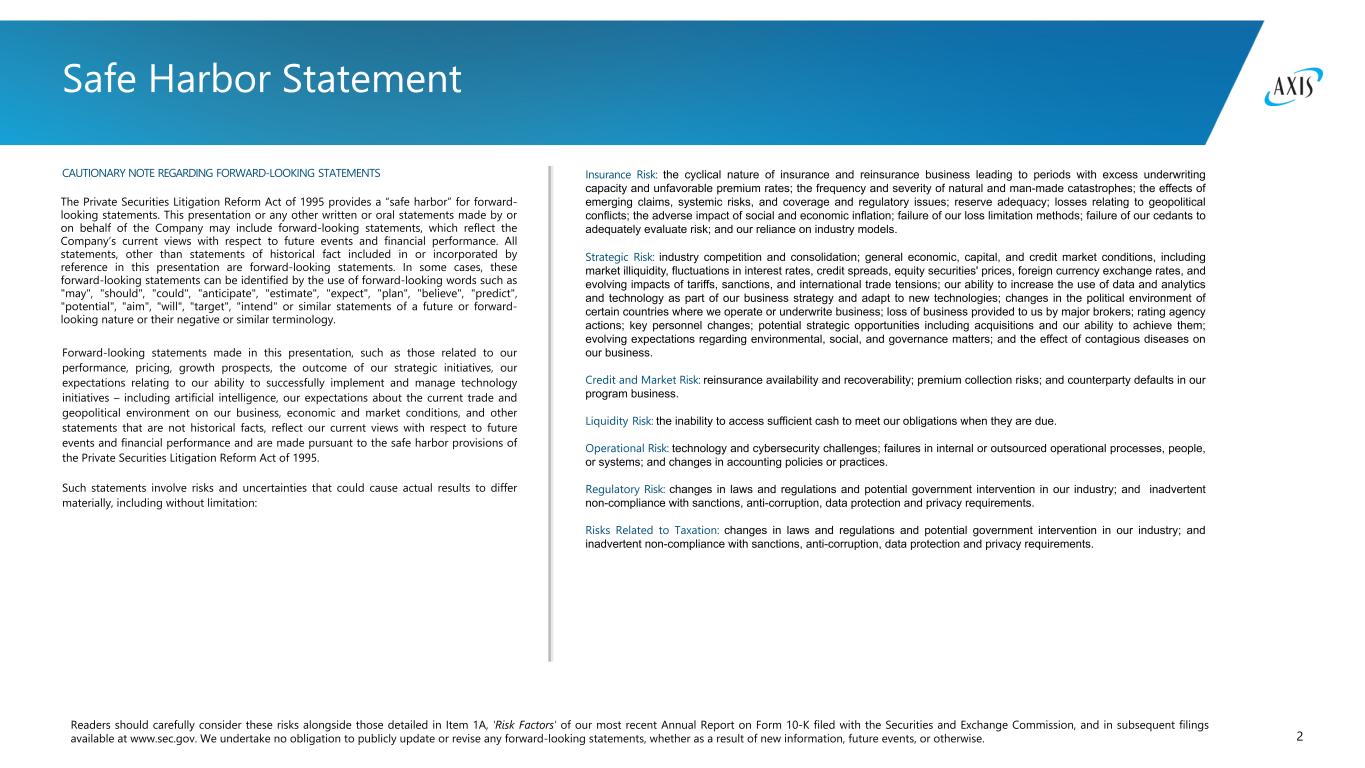 2 Readers should carefully consider these risks alongside those detailed in Item 1A, 'Risk Factors' of our most recent Annual Report on Form 10-K filed with the Securities and Exchange Commission, and in subsequent filings available at www.sec.gov. We undertake no obligation to publicly update or revise any forward-looking statements, whether as a result of new information, future events, or otherwise. Safe Harbor Statement CAUTIONARY NOTE REGARDING FORWARD-LOOKING STATEMENTS The Private Securities Litigation Reform Act of 1995 provides a “safe harbor” for forward- looking statements. This presentation or any other written or oral statements made by or on behalf of the Company may include forward-looking statements, which reflect the Company’s current views with respect to future events and financial performance. All statements, other than statements of historical fact included in or incorporated by reference in this presentation are forward-looking statements. In some cases, these forward-looking statements can be identified by the use of forward-looking words such as "may", "should", "could", "anticipate", "estimate", "expect", "plan", "believe", "predict", "potential", "aim", "will", "target", "intend" or similar statements of a future or forward- looking nature or their negative or similar terminology. Forward-looking statements made in this presentation, such as those related to our performance, pricing, growth prospects, the outcome of our strategic initiatives, our expectations relating to our ability to successfully implement and manage technology initiatives – including artificial intelligence, our expectations about the current trade and geopolitical environment on our business, economic and market conditions, and other statements that are not historical facts, reflect our current views with respect to future events and financial performance and are made pursuant to the safe harbor provisions of the Private Securities Litigation Reform Act of 1995. Such statements involve risks and uncertainties that could cause actual results to differ materially, including without limitation: Insurance Risk: the cyclical nature of insurance and reinsurance business leading to periods with excess underwriting capacity and unfavorable premium rates; the frequency and severity of natural and man-made catastrophes; the effects of emerging claims, systemic risks, and coverage and regulatory issues; reserve adequacy; losses relating to geopolitical conflicts; the adverse impact of social and economic inflation; failure of our loss limitation methods; failure of our cedants to adequately evaluate risk; and our reliance on industry models. Strategic Risk: industry competition and consolidation; general economic, capital, and credit market conditions, including market illiquidity, fluctuations in interest rates, credit spreads, equity securities' prices, foreign currency exchange rates, and evolving impacts of tariffs, sanctions, and international trade tensions; our ability to increase the use of data and analytics and technology as part of our business strategy and adapt to new technologies; changes in the political environment of certain countries where we operate or underwrite business; loss of business provided to us by major brokers; rating agency actions; key personnel changes; potential strategic opportunities including acquisitions and our ability to achieve them; evolving expectations regarding environmental, social, and governance matters; and the effect of contagious diseases on our business. Credit and Market Risk: reinsurance availability and recoverability; premium collection risks; and counterparty defaults in our program business. Liquidity Risk: the inability to access sufficient cash to meet our obligations when they are due. Operational Risk: technology and cybersecurity challenges; failures in internal or outsourced operational processes, people, or systems; and changes in accounting policies or practices. Regulatory Risk: changes in laws and regulations and potential government intervention in our industry; and inadvertent non-compliance with sanctions, anti-corruption, data protection and privacy requirements. Risks Related to Taxation: changes in laws and regulations and potential government intervention in our industry; and inadvertent non-compliance with sanctions, anti-corruption, data protection and privacy requirements.