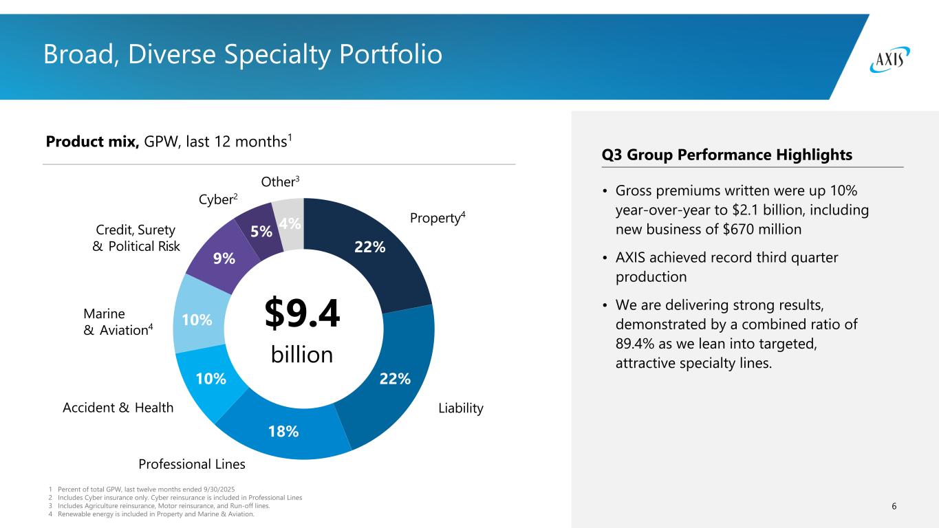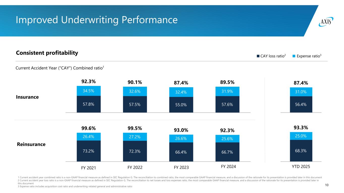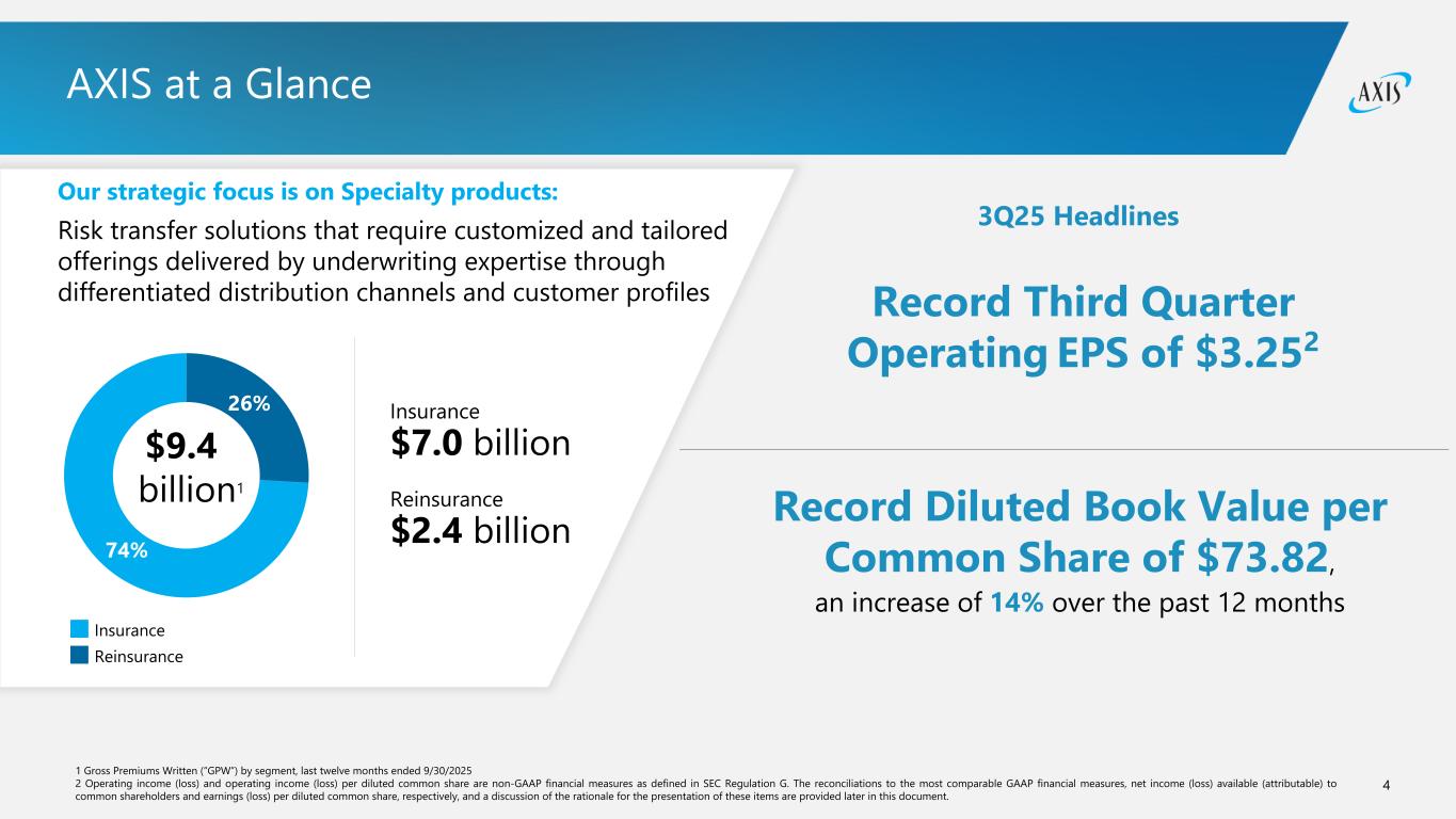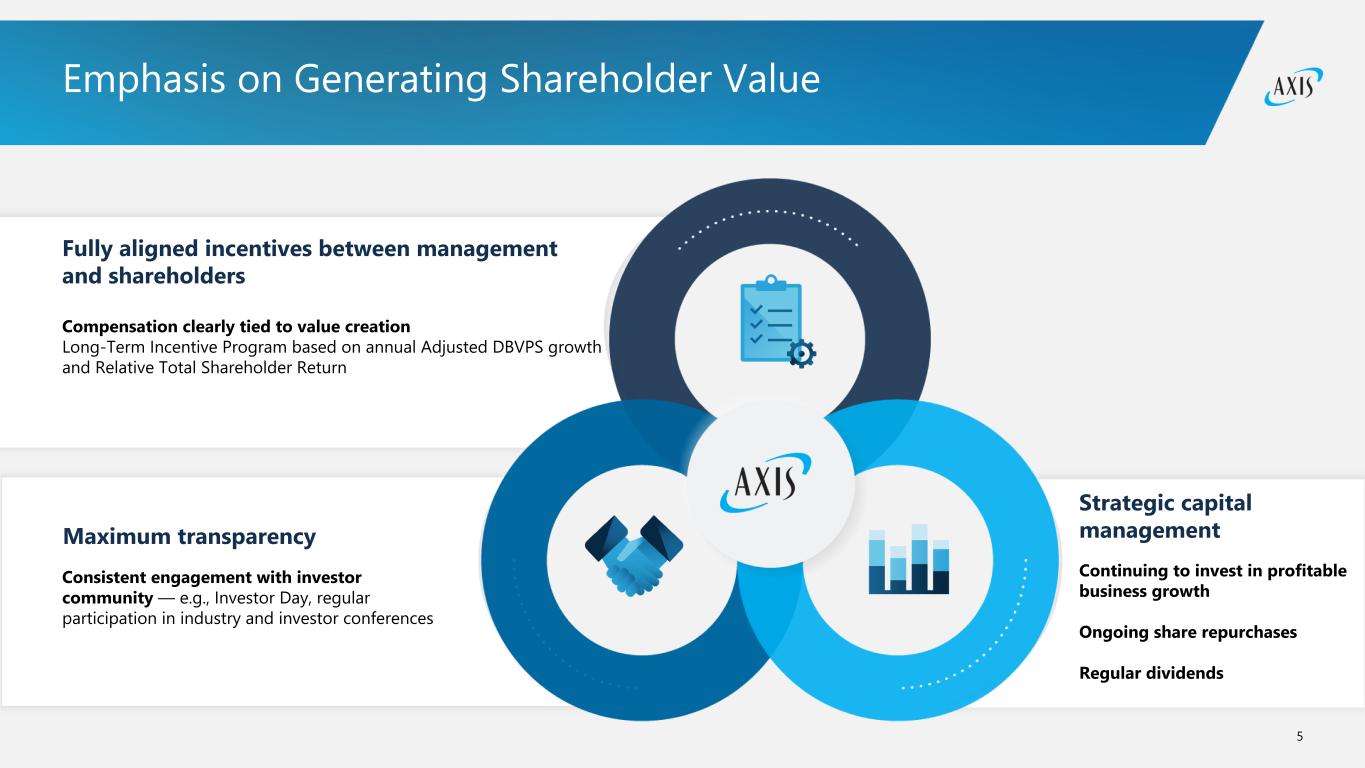 4 AXIS at a Glance Our strategic focus is on Specialty products: Risk transfer solutions that require customized and tailored offerings delivered by underwriting expertise through differentiated distribution channels and customer profiles Insurance Reinsurance Insurance $7.0 billion Reinsurance $2.4 billion $9.4 billion1 Record Third Quarter Operating EPS of $3.252 Record Diluted Book Value per Common Share of $73.82, an increase of 14% over the past 12 months 1 Gross Premiums Written (“GPW”) by segment, last twelve months ended 9/30/2025 2 Operating income (loss) and operating income (loss) per diluted common share are non-GAAP financial measures as defined in SEC Regulation G. The reconciliations to the most comparable GAAP financial measures, net income (loss) available (attributable) to common shareholders and earnings (loss) per diluted common share, respectively, and a discussion of the rationale for the presentation of these items are provided later in this document. 3Q25 Headlines 74% 26%
