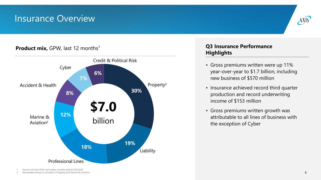 6 22% 22% 18% 10% 10% 9% 5% 4% 1 Percent of total GPW, last twelve months ended 9/30/2025 2 Includes Cyber insurance only. Cyber reinsurance is included in Professional Lines 3 Includes Agriculture reinsurance, Motor reinsurance, and Run-off lines. 4 Renewable energy is included in Property and Marine & Aviation. Broad, Diverse Specialty Portfolio Product mix, GPW, last 12 months1 Q3 Group Performance Highlights Property4 Cyber2 Liability Marine & Aviation4 Accident & Health Other3 Credit, Surety & Political Risk $9.4 billion • Gross premiums written were up 10% year-over-year to $2.1 billion, including new business of $670 million • AXIS achieved record third quarter production • We are delivering strong results, demonstrated by a combined ratio of 89.4% as we lean into targeted, attractive specialty lines. Professional Lines