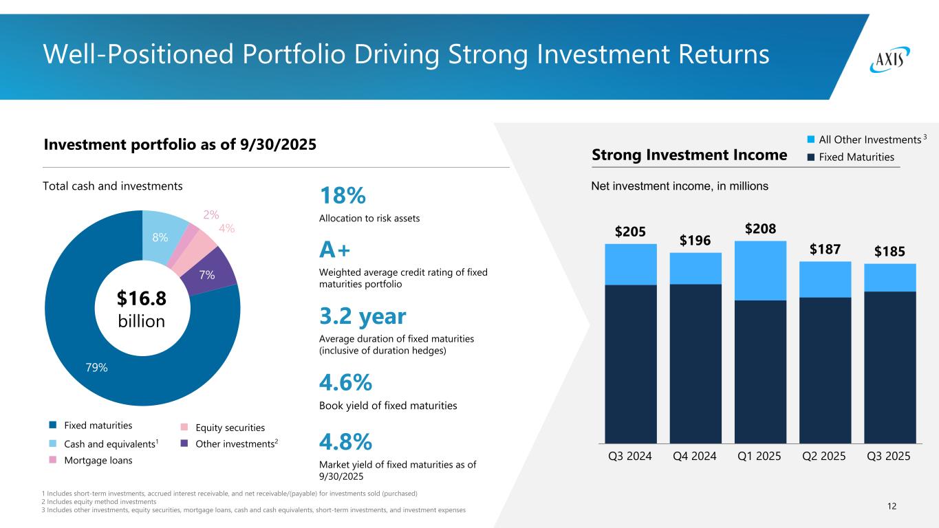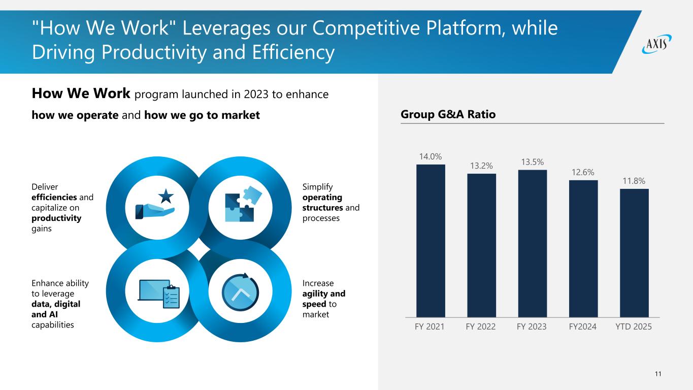 10 99.6% 99.5% 93.0% 92.3% 73.2% 72.3% 66.4% 66.7% 26.4% 27.2% 26.6% 25.6% 92.3% 90.1% 87.4% 89.5% 57.8% 57.5% 55.0% 57.6% 34.5% 32.6% 32.4% 31.9% 1 Current accident year combined ratio is a non-GAAP financial measure as defined in SEC Regulation G. The reconciliation to combined ratio, the most comparable GAAP financial measure, and a discussion of the rationale for its presentation is provided later in this document 2 Current accident year loss ratio is a non-GAAP financial measure as defined in SEC Regulation G. The reconciliation to net losses and loss expenses ratio, the most comparable GAAP financial measure, and a discussion of the rationale for its presentation is provided later in this document 3 Expense ratio includes acquisition cost ratio and underwriting-related general and administrative ratio Improved Underwriting Performance Consistent profitability Current Accident Year ("CAY") Combined ratio1 CAY loss ratio2 Expense ratio3 Insurance Reinsurance 93.3% 68.3% 25.0% 87.4% 56.4% 31.0% FY 2021 FY 2022 FY 2023 FY 2024 YTD 2025