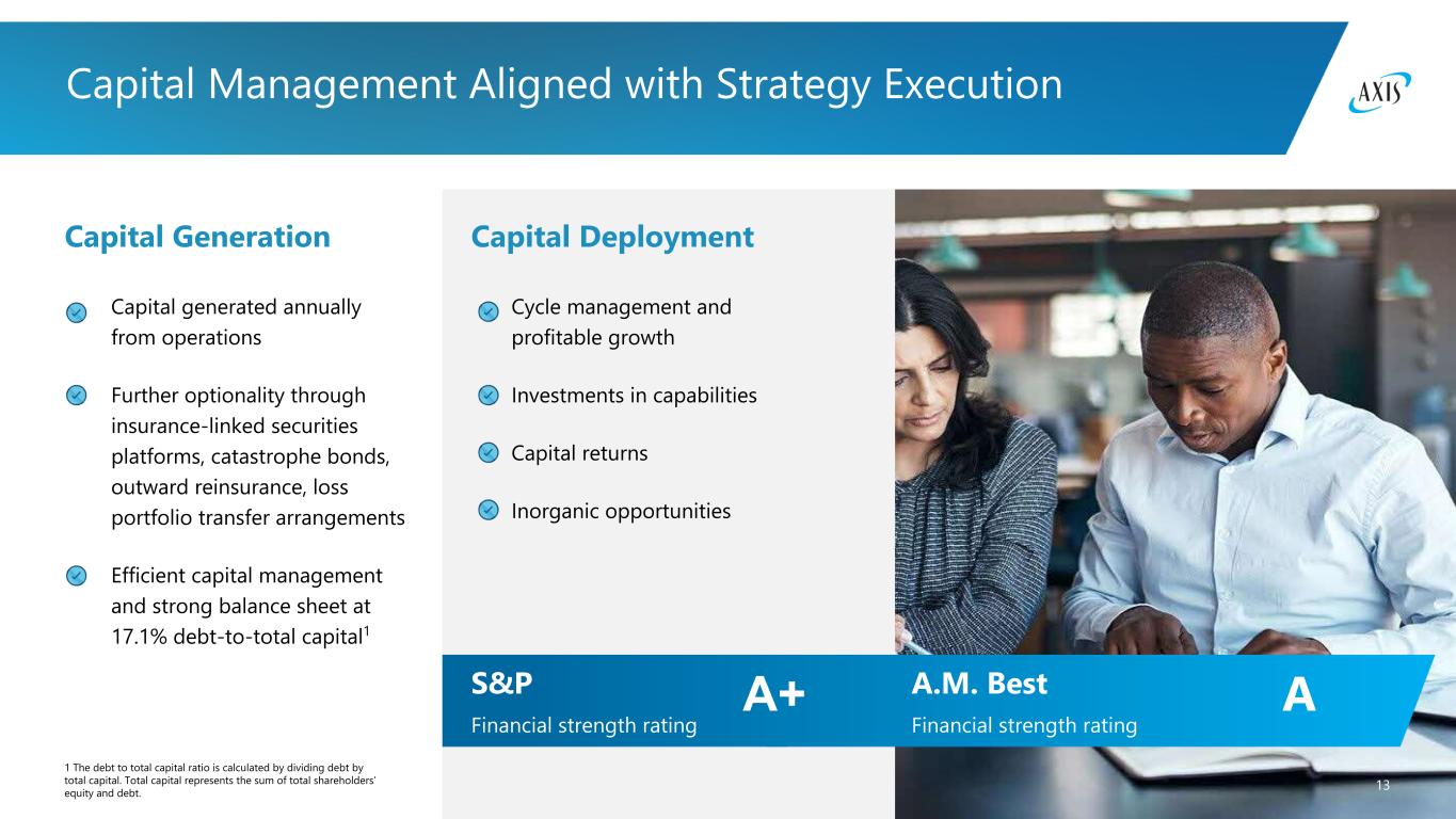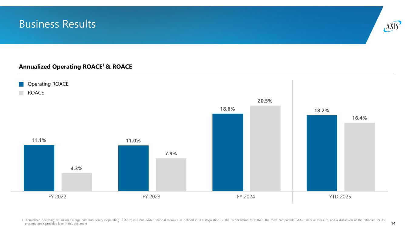 13 A.M. Best Financial strength rating AS&P Financial strength rating A+ Capital Management Aligned with Strategy Execution Capital Deployment Cycle management and profitable growth Investments in capabilities Capital returns Inorganic opportunities Capital Generation Capital generated annually from operations Further optionality through insurance-linked securities platforms, catastrophe bonds, outward reinsurance, loss portfolio transfer arrangements Efficient capital management and strong balance sheet at 17.1% debt-to-total capital1 1 The debt to total capital ratio is calculated by dividing debt by total capital. Total capital represents the sum of total shareholders’ equity and debt.