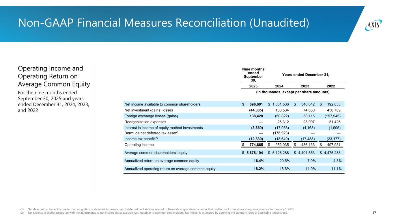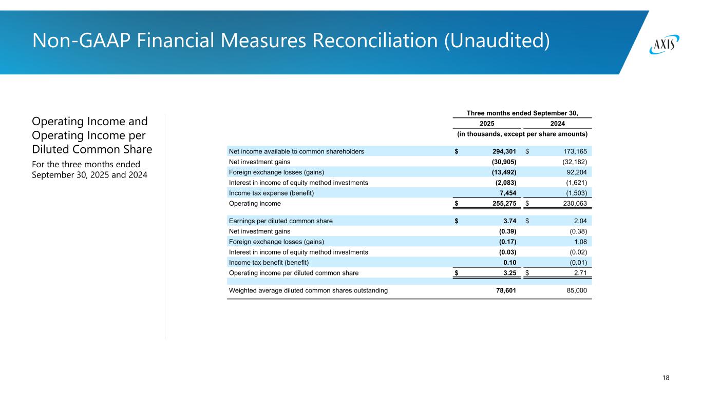 17 Operating Income and Operating Return on Average Common Equity For the nine months ended September 30, 2025 and years ended December 31, 2024, 2023, and 2022 (1) Net deferred tax benefit is due to the recognition of deferred tax assets net of deferred tax liabilities related to Bermuda corporate income tax that is effective for fiscal years beginning on or after January 1, 2025. (2) Tax expense (benefit) associated with the adjustments to net income (loss) available (attributable) to common shareholders. Tax impact is estimated by applying the statutory rates of applicable jurisdictions. Non-GAAP Financial Measures Reconciliation (Unaudited) Nine months ended September 30, Years ended December 31, 2025 2024 2023 2022 (in thousands, except per share amounts) Net income available to common shareholders $ 696,601 $ 1,051,536 $ 346,042 $ 192,833 Net investment (gains) losses (44,365) 138,534 74,630 456,789 Foreign exchange losses (gains) 138,428 (50,822) 58,115 (157,945) Reorganization expenses — 26,312 28,997 31,426 Interest in income of equity method investments (3,669) (17,953) (4,163) (1,995) Bermuda net deferred tax asset(1) — (176,923) — — Income tax benefit(2) (12,330) (18,649) (17,488) (23,177) Operating income $ 774,665 $ 952,035 $ 486,133 $ 497,931 Average common shareholders' equity $ 5,678,194 $ 5,126,288 $ 4,401,553 $ 4,475,283 Annualized return on average common equity 16.4% 20.5% 7.9% 4.3% Annualized operating return on average common equity 18.2% 18.6% 11.0% 11.1%