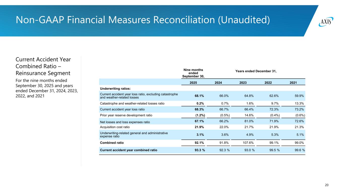 19 Current Accident Year Combined Ratio – Insurance Segment For the nine months ended September 30, 2025 and years ended December 31, 2024, 2023, 2022, and 2021 Non-GAAP Financial Measures Reconciliation (Unaudited) Nine months ended September 30, Years ended December 31, 2025 2024 2023 2022 2021 Underwriting ratios: Current accident year loss ratio, excluding catastrophe and weather-related losses 52.3% 52.1% 51.8% 51.0% 51.4% Catastrophe and weather-related losses ratio 4.1% 5.5% 3.2% 6.5% 6.4% Current accident year loss ratio 56.4% 57.6% 55.0% 57.5% 57.8% Prior year reserve development ratio (1.4%) (0.4%) 5.1% (0.5%) (0.7%) Net losses and loss expenses ratio 55.0% 57.2% 60.1% 57.0% 57.1% Acquisition cost ratio 19.0% 19.5% 18.7% 18.4% 18.3% Underwriting-related general and administrative expense ratio 12.0% 12.4% 13.7% 14.2% 16.2% Combined ratio 86.0% 89.1% 92.5% 89.6% 91.6% Current accident year combined ratio 87.4% 89.5% 87.4% 90.1% 92.3%