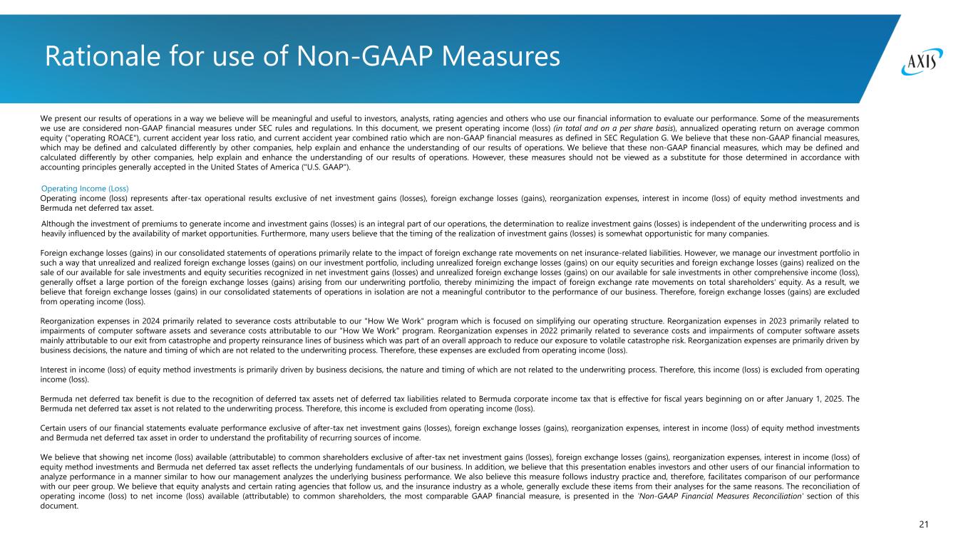 21 Rationale for use of Non-GAAP Measures We present our results of operations in a way we believe will be meaningful and useful to investors, analysts, rating agencies and others who use our financial information to evaluate our performance. Some of the measurements we use are considered non-GAAP financial measures under SEC rules and regulations. In this document, we present operating income (loss) (in total and on a per share basis), annualized operating return on average common equity ("operating ROACE"), current accident year loss ratio, and current accident year combined ratio which are non-GAAP financial measures as defined in SEC Regulation G. We believe that these non-GAAP financial measures, which may be defined and calculated differently by other companies, help explain and enhance the understanding of our results of operations. We believe that these non-GAAP financial measures, which may be defined and calculated differently by other companies, help explain and enhance the understanding of our results of operations. However, these measures should not be viewed as a substitute for those determined in accordance with accounting principles generally accepted in the United States of America ("U.S. GAAP"). Operating Income (Loss) Operating income (loss) represents after-tax operational results exclusive of net investment gains (losses), foreign exchange losses (gains), reorganization expenses, interest in income (loss) of equity method investments and Bermuda net deferred tax asset. Although the investment of premiums to generate income and investment gains (losses) is an integral part of our operations, the determination to realize investment gains (losses) is independent of the underwriting process and is heavily influenced by the availability of market opportunities. Furthermore, many users believe that the timing of the realization of investment gains (losses) is somewhat opportunistic for many companies. Foreign exchange losses (gains) in our consolidated statements of operations primarily relate to the impact of foreign exchange rate movements on net insurance-related liabilities. However, we manage our investment portfolio in such a way that unrealized and realized foreign exchange losses (gains) on our investment portfolio, including unrealized foreign exchange losses (gains) on our equity securities and foreign exchange losses (gains) realized on the sale of our available for sale investments and equity securities recognized in net investment gains (losses) and unrealized foreign exchange losses (gains) on our available for sale investments in other comprehensive income (loss), generally offset a large portion of the foreign exchange losses (gains) arising from our underwriting portfolio, thereby minimizing the impact of foreign exchange rate movements on total shareholders' equity. As a result, we believe that foreign exchange losses (gains) in our consolidated statements of operations in isolation are not a meaningful contributor to the performance of our business. Therefore, foreign exchange losses (gains) are excluded from operating income (loss). Reorganization expenses in 2024 primarily related to severance costs attributable to our "How We Work" program which is focused on simplifying our operating structure. Reorganization expenses in 2023 primarily related to impairments of computer software assets and severance costs attributable to our "How We Work" program. Reorganization expenses in 2022 primarily related to severance costs and impairments of computer software assets mainly attributable to our exit from catastrophe and property reinsurance lines of business which was part of an overall approach to reduce our exposure to volatile catastrophe risk. Reorganization expenses are primarily driven by business decisions, the nature and timing of which are not related to the underwriting process. Therefore, these expenses are excluded from operating income (loss). Interest in income (loss) of equity method investments is primarily driven by business decisions, the nature and timing of which are not related to the underwriting process. Therefore, this income (loss) is excluded from operating income (loss). Bermuda net deferred tax benefit is due to the recognition of deferred tax assets net of deferred tax liabilities related to Bermuda corporate income tax that is effective for fiscal years beginning on or after January 1, 2025. The Bermuda net deferred tax asset is not related to the underwriting process. Therefore, this income is excluded from operating income (loss). Certain users of our financial statements evaluate performance exclusive of after-tax net investment gains (losses), foreign exchange losses (gains), reorganization expenses, interest in income (loss) of equity method investments and Bermuda net deferred tax asset in order to understand the profitability of recurring sources of income. We believe that showing net income (loss) available (attributable) to common shareholders exclusive of after-tax net investment gains (losses), foreign exchange losses (gains), reorganization expenses, interest in income (loss) of equity method investments and Bermuda net deferred tax asset reflects the underlying fundamentals of our business. In addition, we believe that this presentation enables investors and other users of our financial information to analyze performance in a manner similar to how our management analyzes the underlying business performance. We also believe this measure follows industry practice and, therefore, facilitates comparison of our performance with our peer group. We believe that equity analysts and certain rating agencies that follow us, and the insurance industry as a whole, generally exclude these items from their analyses for the same reasons. The reconciliation of operating income (loss) to net income (loss) available (attributable) to common shareholders, the most comparable GAAP financial measure, is presented in the 'Non-GAAP Financial