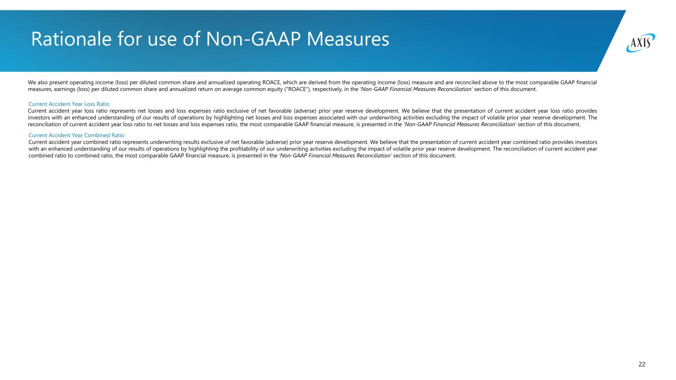 22 Rationale for use of Non-GAAP Measures We also present operating income (loss) per diluted common share and annualized operating ROACE, which are derived from the operating income (loss) measure and are reconciled above to the most comparable GAAP financial measures, earnings (loss) per diluted common share and annualized return on average common equity ("ROACE"), respectively, in the 'Non-GAAP Financial Measures Reconciliation' section of this document. Current Accident Year Loss Ratio Current accident year loss ratio represents net losses and loss expenses ratio exclusive of net favorable (adverse) prior year reserve development. We believe that the presentation of current accident year loss ratio provides investors with an enhanced understanding of our results of operations by highlighting net losses and loss expenses associated with our underwriting activities excluding the impact of volatile prior year reserve development. The reconciliation of current accident year loss ratio to net losses and loss expenses ratio, the most comparable GAAP financial measure, is presented in the 'Non-GAAP Financial Measures Reconciliation' section of this document. Current Accident Year Combined Ratio Current accident year combined ratio represents underwriting results exclusive of net favorable (adverse) prior year reserve development. We believe that the presentation of current accident year combined ratio provides investors with an enhanced understanding of our results of operations by highlighting the profitability of our underwriting activities excluding the impact of volatile prior year reserve development. The reconciliation of current accident year combined ratio to combined ratio, the most comparable GAAP financial measure, is presented in the 'Non-GAAP Financial Measures Reconciliation' section of this document.