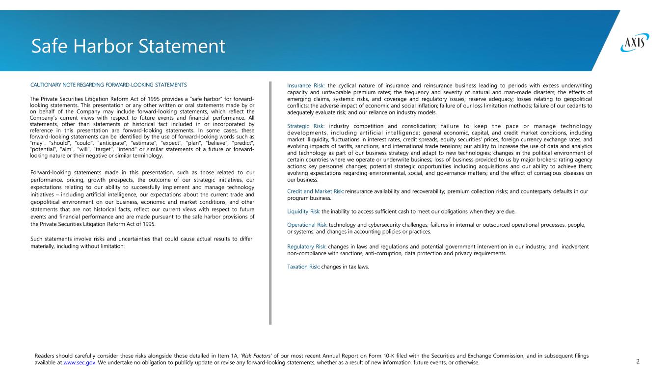 2 Readers should carefully consider these risks alongside those detailed in Item 1A, 'Risk Factors' of our most recent Annual Report on Form 10-K filed with the Securities and Exchange Commission, and in subsequent filings available at www.sec.gov. We undertake no obligation to publicly update or revise any forward-looking statements, whether as a result of new information, future events, or otherwise. Safe Harbor Statement CAUTIONARY NOTE REGARDING FORWARD-LOOKING STATEMENTS The Private Securities Litigation Reform Act of 1995 provides a “safe harbor” for forward- looking statements. This presentation or any other written or oral statements made by or on behalf of the Company may include forward-looking statements, which reflect the Company’s current views with respect to future events and financial performance. All statements, other than statements of historical fact included in or incorporated by reference in this presentation are forward-looking statements. In some cases, these forward-looking statements can be identified by the use of forward-looking words such as "may", "should", "could", "anticipate", "estimate", "expect", "plan", "believe", "predict", "potential", "aim", "will", "target", "intend" or similar statements of a future or forward- looking nature or their negative or similar terminology. Forward-looking statements made in this presentation, such as those related to our performance, pricing, growth prospects, the outcome of our strategic initiatives, our expectations relating to our ability to successfully implement and manage technology initiatives – including artificial intelligence, our expectations about the current trade and geopolitical environment on our business, economic and market conditions, and other statements that are not historical facts, reflect our current views with respect to future events and financial performance and are made pursuant to the safe harbor provisions of the Private Securities Litigation Reform Act of 1995. Such statements involve risks and uncertainties that could cause actual results to differ materially, including without limitation: Insurance Risk: the cyclical nature of insurance and reinsurance business leading to periods with excess underwriting capacity and unfavorable premium rates; the frequency and severity of natural and man-made disasters; the effects of emerging claims, systemic risks, and coverage and regulatory issues; reserve adequacy; losses relating to geopolitical conflicts; the adverse impact of economic and social inflation; failure of our loss limitation methods; failure of our cedants to adequately evaluate risk; and our reliance on industry models. Strategic Risk: industry competition and consolidation; failure to keep the pace or manage technology developments, including artificial intelligence; general economic, capital, and credit market conditions, including market illiquidity, fluctuations in interest rates, credit spreads, equity securities' prices, foreign currency exchange rates, and evolving impacts of tariffs, sanctions, and international trade tensions; our ability to increase the use of data and analytics and technology as part of our business strategy and adapt to new technologies; changes in the political environment of certain countries where we operate or underwrite business; loss of business provided to us by major brokers; rating agency actions; key personnel changes; potential strategic opportunities including acquisitions and our ability to achieve them; evolving expectations regarding environmental, social, and governance matters; and the effect of contagious diseases on our business. Credit and Market Risk: reinsurance availability and recoverability; premium collection risks; and counterparty defaults in our program business. Liquidity Risk: the inability to access sufficient cash to meet our obligations when they are due. Operational Risk: technology and cybersecurity challenges; failures in internal or outsourced operational processes, people, or systems; and changes in accounting policies or practices. Regulatory Risk: changes in laws and regulations and potential government intervention in our industry; and inadvertent non-compliance with sanctions, anti-corruption, data protection and privacy requirements. Taxation Risk: changes in tax laws.