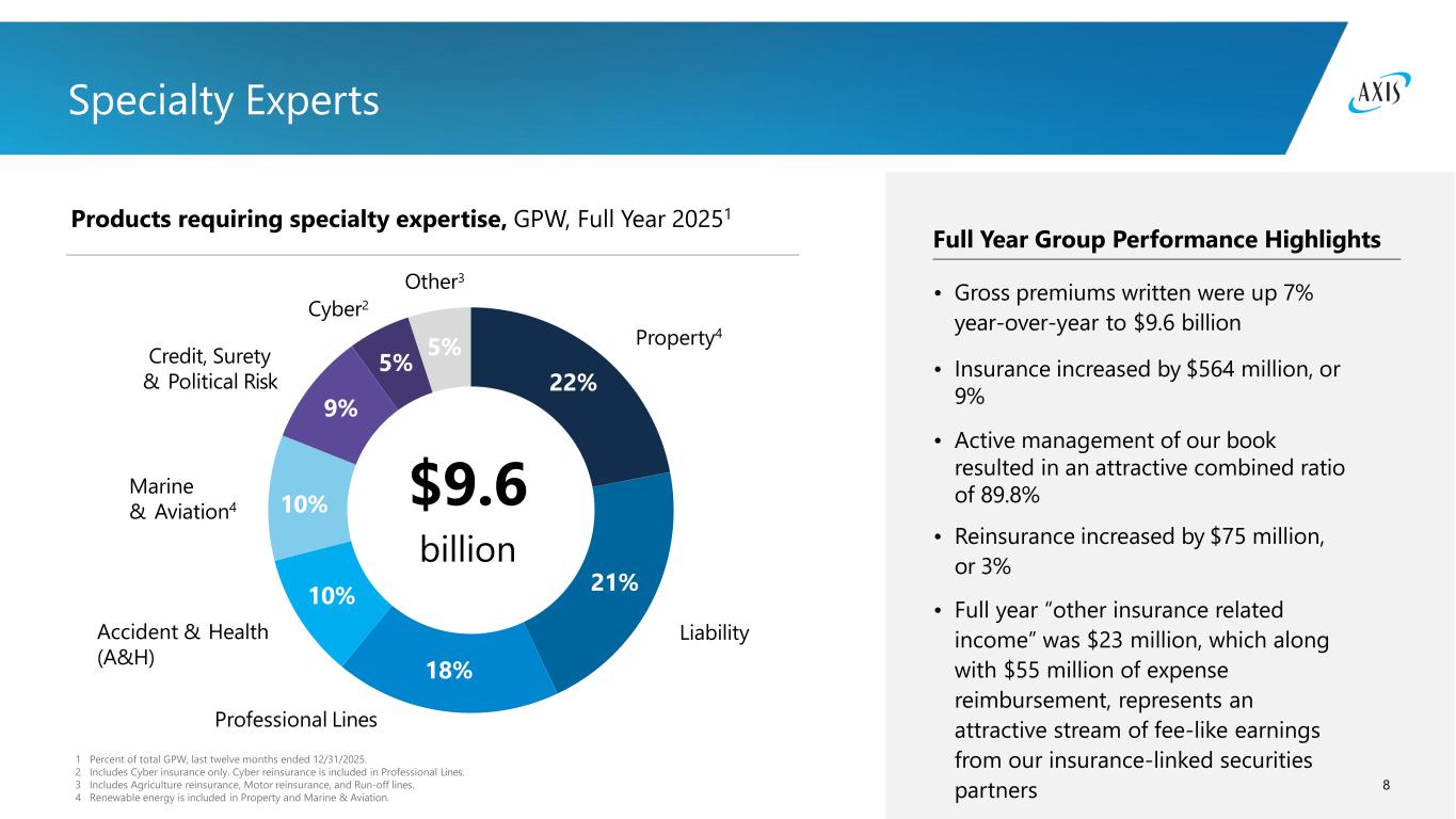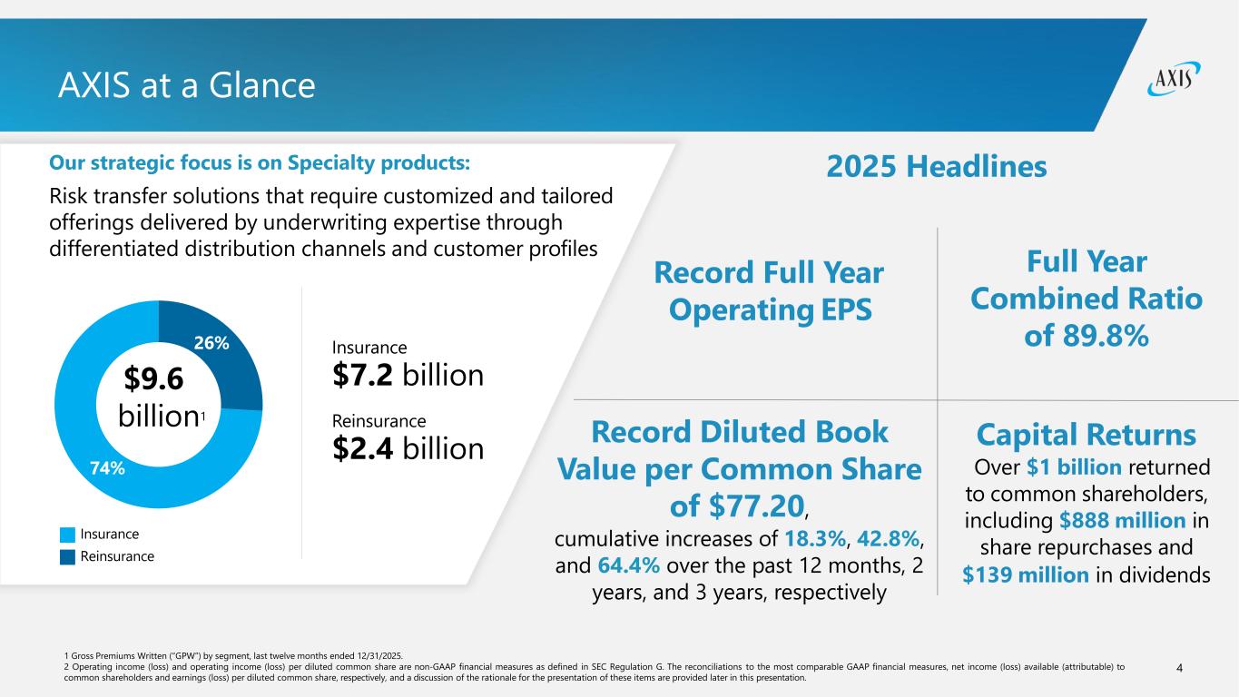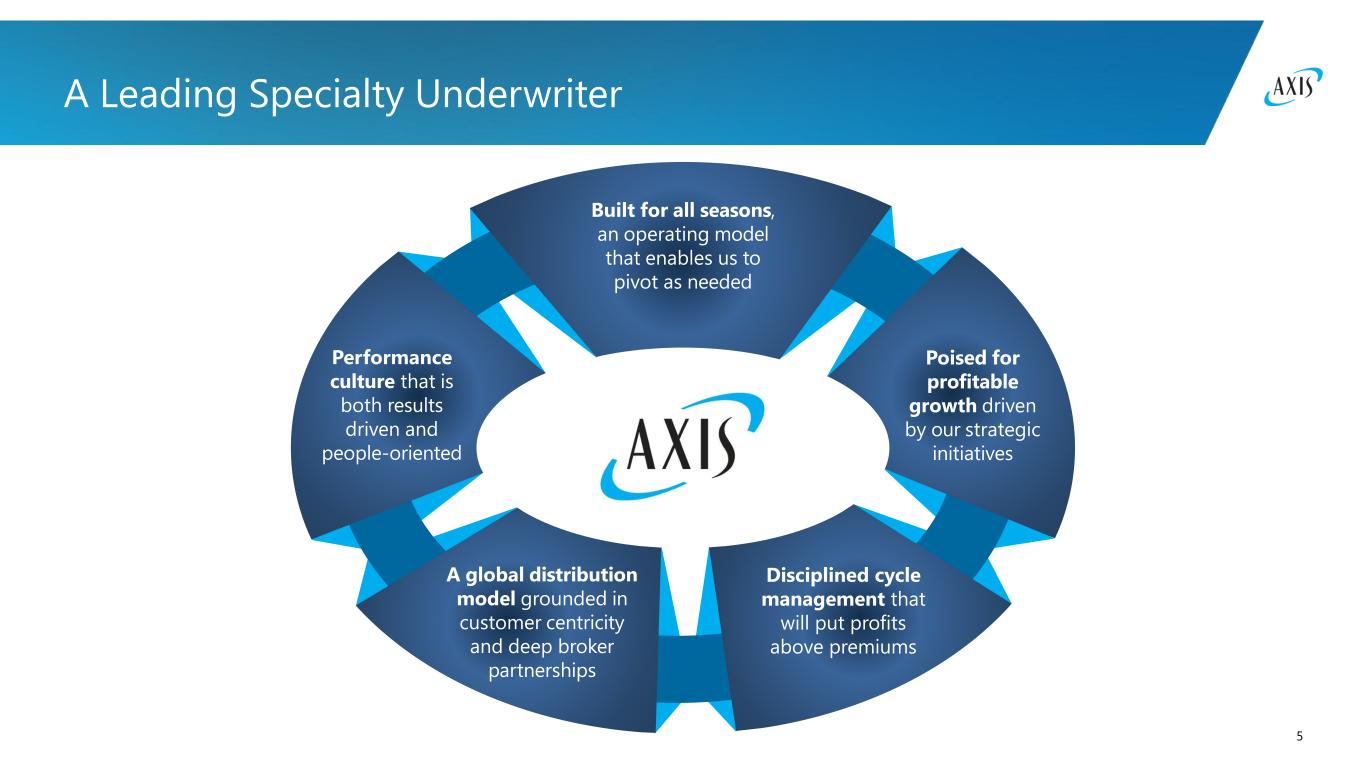 4 AXIS at a Glance Our strategic focus is on Specialty products: Risk transfer solutions that require customized and tailored offerings delivered by underwriting expertise through differentiated distribution channels and customer profiles Insurance Reinsurance Insurance $7.2 billion Reinsurance $2.4 billion Record Full Year Operating EPS Record Diluted Book Value per Common Share of $77.20, cumulative increases of 18.3%, 42.8%, and 64.4% over the past 12 months, 2 years, and 3 years, respectively 1 Gross Premiums Written (“GPW”) by segment, last twelve months ended 12/31/2025. 2 Operating income (loss) and operating income (loss) per diluted common share are non-GAAP financial measures as defined in SEC Regulation G. The reconciliations to the most comparable GAAP financial measures, net income (loss) available (attributable) to common shareholders and earnings (loss) per diluted common share, respectively, and a discussion of the rationale for the presentation of these items are provided later in this presentation. 2025 Headlines $9.6 billion1 74% 26% Full Year Combined Ratio of 89.8% Capital Returns Over $1 billion returned to common shareholders, including $888 million in share repurchases and $139 million in dividends