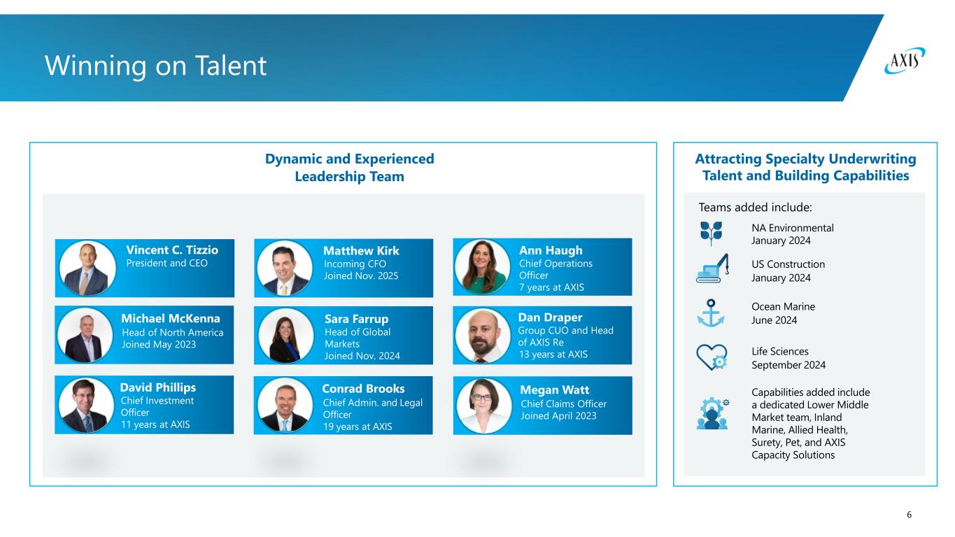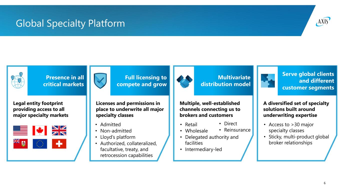 5 A Leading Specialty Underwriter Performance culture that is both results driven and people-oriented Built for all seasons, an operating model that enables us to pivot as needed Poised for profitable growth driven by our strategic initiatives Disciplined cycle management that will put profits above premiums A global distribution model grounded in customer centricity and deep broker partnerships