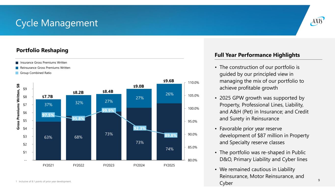 8 22% 21% 18% 10% 10% 9% 5% 5% Specialty Experts Products requiring specialty expertise, GPW, Full Year 20251 Full Year Group Performance Highlights Property4 Cyber2 Liability Marine & Aviation4 Accident & Health (A&H) Other3 Credit, Surety & Political Risk $9.6 billion Professional Lines 1 Percent of total GPW, last twelve months ended 12/31/2025. 2 Includes Cyber insurance only. Cyber reinsurance is included in Professional Lines. 3 Includes Agriculture reinsurance, Motor reinsurance, and Run-off lines. 4 Renewable energy is included in Property and Marine & Aviation. • Gross premiums written were up 7% year-over-year to $9.6 billion • Insurance increased by $564 million, or 9% • Active management of our book resulted in an attractive combined ratio of 89.8% • Reinsurance increased by $75 million, or 3% • Full year “other insurance related income” was $23 million, which along with $55 million of expense reimbursement, represents an attractive stream of fee-like earnings from our insurance-linked securities partners