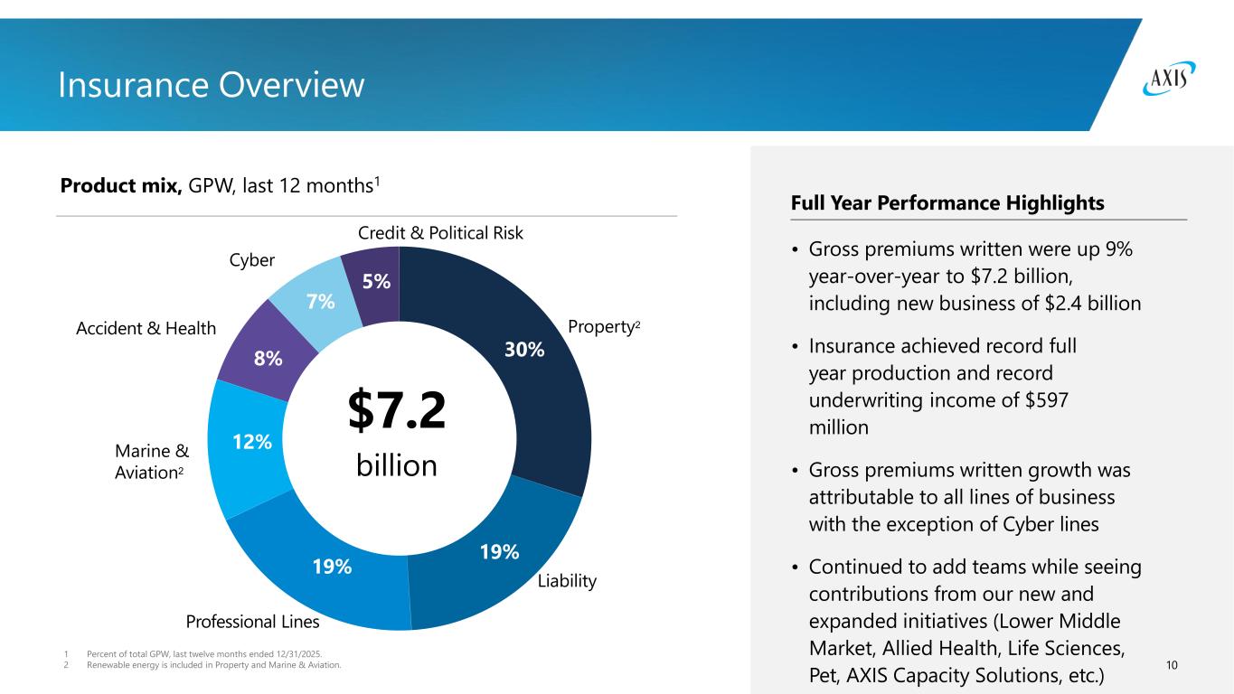 80.0% 85.0% 90.0% 95.0% 100.0% 105.0% 110.0% -- $1 $2 $3 $4 $5 $6 $7 $8 $9 FY2021 FY2022 FY2023 FY2024 FY2025 G ro ss P re m iu m s W ri tt e n , $ B 1 Inclusive of 8.1 points of prior year development. Cycle Management 9 Full Year Performance Highlights • The construction of our portfolio is guided by our principled view in managing the mix of our portfolio to achieve profitable growth • 2025 GPW growth was supported by Property, Professional Lines, Liability, and A&H (Pet) in Insurance; and Credit and Surety in Reinsurance • Favorable prior year reserve development of $87 million in Property and Specialty reserve classes • The portfolio was re-shaped in Public D&O, Primary Liability and Cyber lines • We remained cautious in Liability Reinsurance, Motor Reinsurance, and Cyber Insurance Gross Premiums Written Reinsurance Gross Premiums Written Group Combined Ratio $7.7B $8.2B $8.4B $9.0B $9.6B 37% 32% 27% 27% 26% 63% 68% 73% 73% 74% 97.5% 95.8% 99.9% 1 92.3% 89.8% Portfolio Reshaping