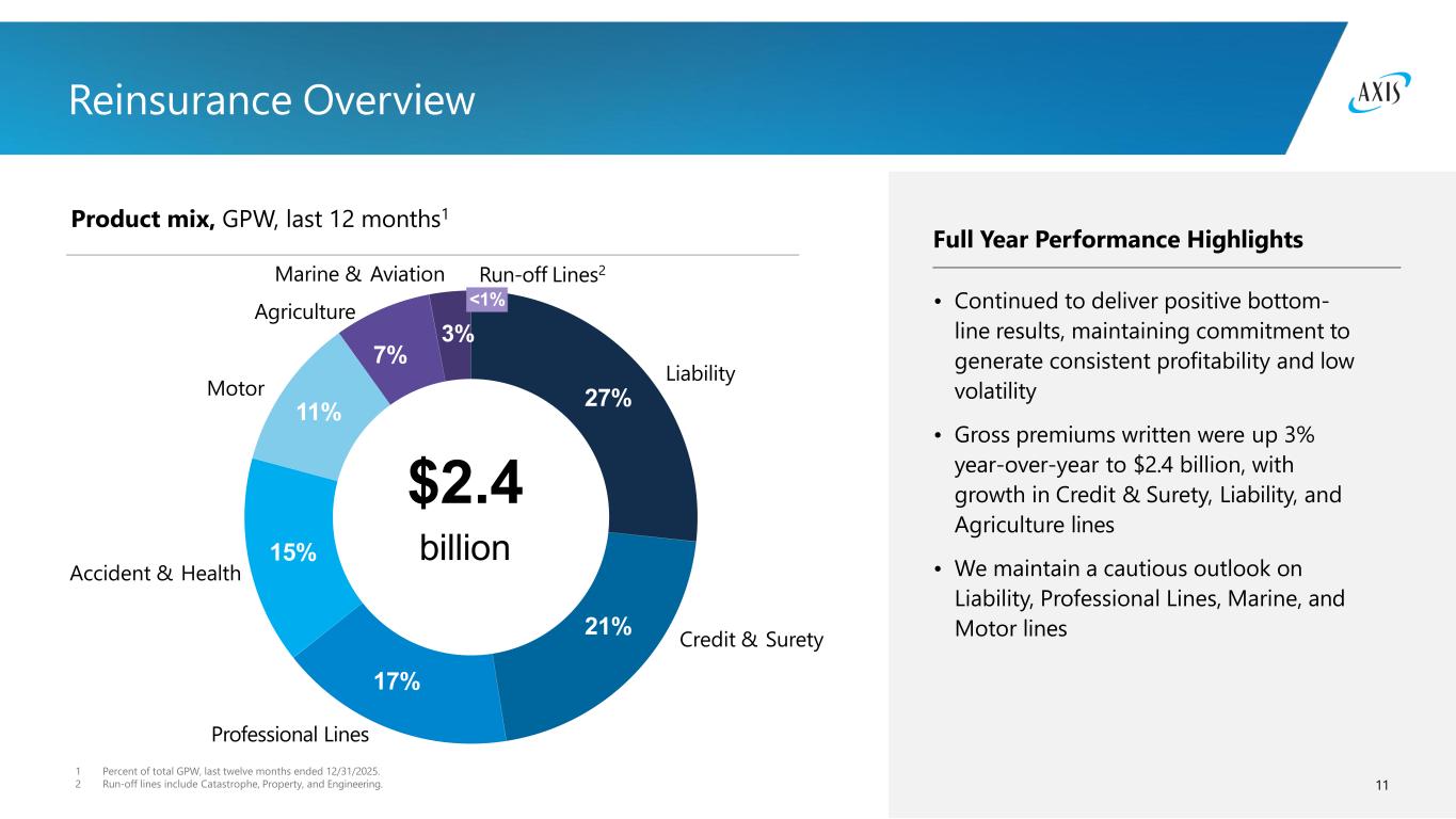 10 Insurance Overview • Gross premiums written were up 9% year-over-year to $7.2 billion, including new business of $2.4 billion • Insurance achieved record full year production and record underwriting income of $597 million • Gross premiums written growth was attributable to all lines of business with the exception of Cyber lines • Continued to add teams while seeing contributions from our new and expanded initiatives (Lower Middle Market, Allied Health, Life Sciences, Pet, AXIS Capacity Solutions, etc.) Product mix, GPW, last 12 months1 30% Property2 19% Professional Lines 1 Percent of total GPW, last twelve months ended 12/31/2025. 2 Renewable energy is included in Property and Marine & Aviation. Cyber 19% Liability 12%Marine & Aviation2 8% 7% Accident & Health 5% $7.2 billion Credit & Political Risk Full Year Performance Highlights