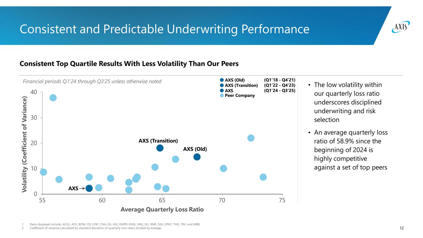 11 Reinsurance Overview Product mix, GPW, last 12 months1 Marine & Aviation 27% 21% Credit & Surety Motor 17% Liability 15% Professional Lines 1 Percent of total GPW, last twelve months ended 12/31/2025. 2 Run-off lines include Catastrophe, Property, and Engineering. 11% 7% Agriculture $2.4 billion Accident & Health 3% Run-off Lines2 <1% • Continued to deliver positive bottom- line results, maintaining commitment to generate consistent profitability and low volatility • Gross premiums written were up 3% year-over-year to $2.4 billion, with growth in Credit & Surety, Liability, and Agriculture lines • We maintain a cautious outlook on Liability, Professional Lines, Marine, and Motor lines Full Year Performance Highlights