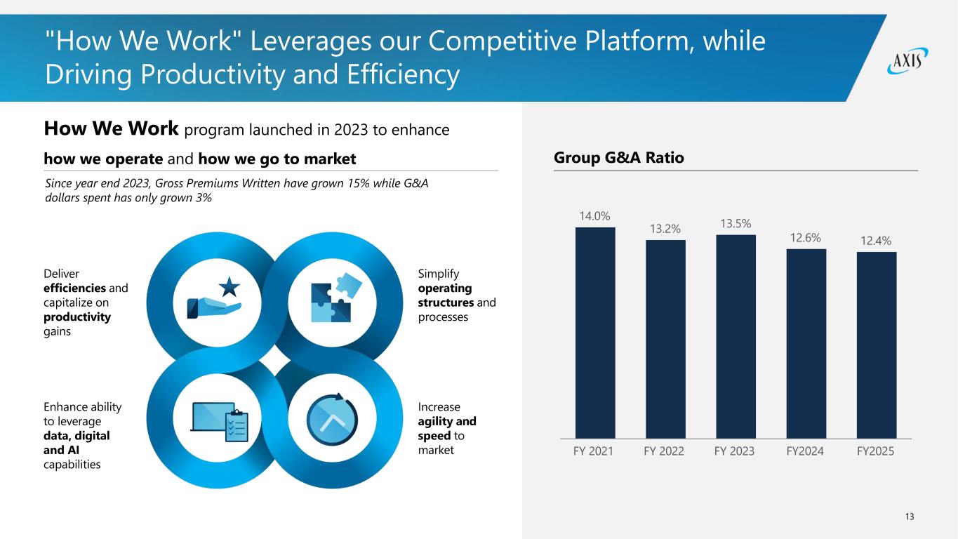 12 Consistent and Predictable Underwriting Performance V o la ti li ty (C o e ff ic ie n t o f V a ri a n c e ) 55 60 65 Average Quarterly Loss Ratio 70 75 0 10 20 30 40 AXS 1 Peers displayed include: ACGL, AFG, BOW, CB, CINF, CNA, EG, HIG, KMPR, KNSL, MKL, RLI, RNR, SIGI, SPNT, THG, TRV, and WRB. 2 Coefficient of variance calculated by standard deviation of quarterly loss ratios divided by average. • The low volatility within our quarterly loss ratio underscores disciplined underwriting and risk selection • An average quarterly loss ratio of 58.9% since the beginning of 2024 is highly competitive against a set of top peers Financial periods Q1’24 through Q3’25 unless otherwise noted AXS (Transition) AXS (Old) AXS (Old) AXS (Transition) AXS (Q1’18 - Q4’21) (Q1’22 - Q4’23) (Q1’24 - Q3’25) Peer Company Consistent Top Quartile Results With Less Volatility Than Our Peers