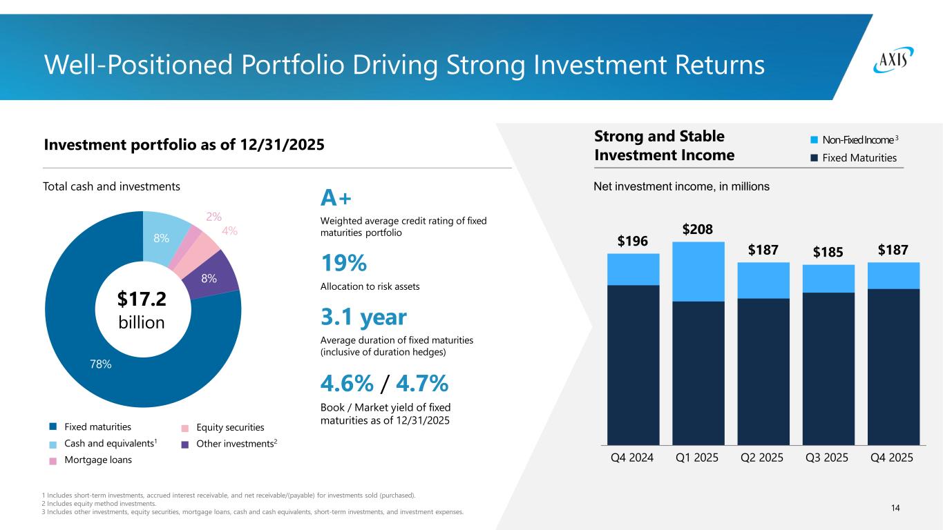 13 14.0% 13.2% 13.5% 12.6% 12.4% FY 2021 FY 2022 FY 2023 FY2024 FY2025 "How We Work" Leverages our Competitive Platform, while Driving Productivity and Efficiency How We Work program launched in 2023 to enhance how we operate and how we go to market Simplify operating structures and processes Increase agility and speed to market Deliver efficiencies and capitalize on productivity gains Enhance ability to leverage data, digital and AI capabilities Group G&A Ratio Since year end 2023, Gross Premiums Written have grown 15% while G&A dollars spent has only grown 3%