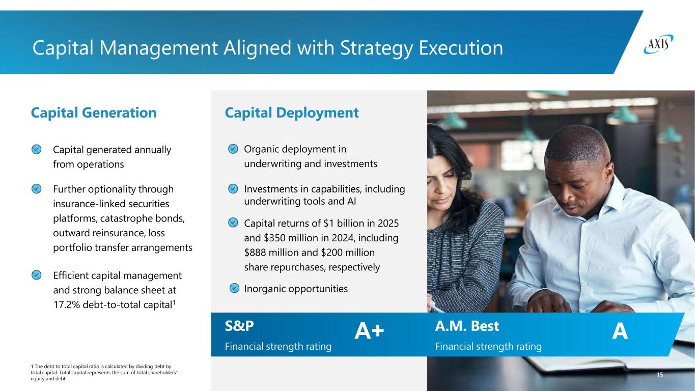14 S A+ Weighted average credit rating of fixed $196 $208 $187 $185 $187 Q4 2024 Q1 2025 Q2 2025 Q3 2025 Q4 2025 8% 2% 4% 8% 78% 1 Includes short-term investments, accrued interest receivable, and net receivable/(payable) for investments sold (purchased). 2 Includes equity method investments. 3 Includes other investments, equity securities, mortgage loans, cash and cash equivalents, short-term investments, and investment expenses. Well-Positioned Portfolio Driving Strong Investment Returns Investment portfolio as of 12/31/2025 Strong and Stable Investment Income Total cash and investments Net investment income, in millions Non-Fixed Income3 Fixed Maturities maturities portfolio 19% Allocation to risk assets 3.1 year Average duration of fixed maturities (inclusive of duration hedges) 4.6% / 4.7% Book / Market yield of fixed maturities as of 12/31/2025 $17.2 billion Fixed maturities Cash and equivalents1 Mortgage loans Equity securities Other investments2