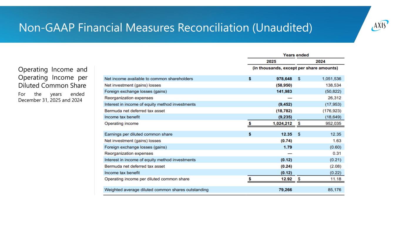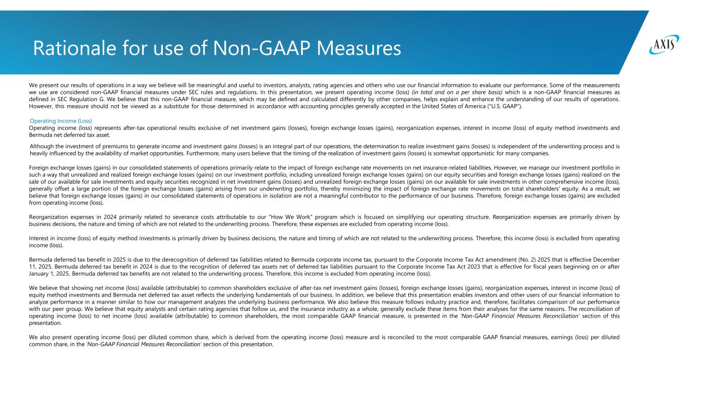 Rationale for use of Non-GAAP Measures We present our results of operations in a way we believe will be meaningful and useful to investors, analysts, rating agencies and others who use our financial information to evaluate our performance. Some of the measurements we use are considered non-GAAP financial measures under SEC rules and regulations. In this presentation, we present operating income (loss) (in total and on a per share basis) which is a non-GAAP financial measures as defined in SEC Regulation G. We believe that this non-GAAP financial measure, which may be defined and calculated differently by other companies, helps explain and enhance the understanding of our results of operations. However, this measure should not be viewed as a substitute for those determined in accordance with accounting principles generally accepted in the United States of America ("U.S. GAAP"). Operating Income (Loss) Operating income (loss) represents after-tax operational results exclusive of net investment gains (losses), foreign exchange losses (gains), reorganization expenses, interest in income (loss) of equity method investments and Bermuda net deferred tax asset. Although the investment of premiums to generate income and investment gains (losses) is an integral part of our operations, the determination to realize investment gains (losses) is independent of the underwriting process and is heavily influenced by the availability of market opportunities. Furthermore, many users believe that the timing of the realization of investment gains (losses) is somewhat opportunistic for many companies. Foreign exchange losses (gains) in our consolidated statements of operations primarily relate to the impact of foreign exchange rate movements on net insurance-related liabilities. However, we manage our investment portfolio in such a way that unrealized and realized foreign exchange losses (gains) on our investment portfolio, including unrealized foreign exchange losses (gains) on our equity securities and foreign exchange losses (gains) realized on the sale of our available for sale investments and equity securities recognized in net investment gains (losses) and unrealized foreign exchange losses (gains) on our available for sale investments in other comprehensive income (loss), generally offset a large portion of the foreign exchange losses (gains) arising from our underwriting portfolio, thereby minimizing the impact of foreign exchange rate movements on total shareholders' equity. As a result, we believe that foreign exchange losses (gains) in our consolidated statements of operations in isolation are not a meaningful contributor to the performance of our business. Therefore, foreign exchange losses (gains) are excluded from operating income (loss). Reorganization expenses in 2024 primarily related to severance costs attributable to our "How We Work" program which is focused on simplifying our operating structure. Reorganization expenses are primarily driven by business decisions, the nature and timing of which are not related to the underwriting process. Therefore, these expenses are excluded from operating income (loss). Interest in income (loss) of equity method investments is primarily driven by business decisions, the nature and timing of which are not related to the underwriting process. Therefore, this income (loss) is excluded from operating income (loss). Bermuda deferred tax benefit in 2025 is due to the derecognition of deferred tax liabilities related to Bermuda corporate income tax, pursuant to the Corporate Income Tax Act amendment (No. 2) 2025 that is effective December 11, 2025. Bermuda deferred tax benefit in 2024 is due to the recognition of deferred tax assets net of deferred tax liabilities pursuant to the Corporate Income Tax Act 2023 that is effective for fiscal years beginning on or after January 1, 2025. Bermuda deferred tax benefits are not related to the underwriting process. Therefore, this income is excluded from operating income (loss). We believe that showing net income (loss) available (attributable) to common shareholders exclusive of after-tax net investment gains (losses), foreign exchange losses (gains), reorganization expenses, interest in income (loss) of equity method investments and Bermuda net deferred tax asset reflects the underlying fundamentals of our business. In addition, we believe that this presentation enables investors and other users of our financial information to analyze performance in a manner similar to how our management analyzes the underlying business performance. We also believe this measure follows industry practice and, therefore, facilitates comparison of our performance with our peer group. We believe that equity analysts and certain rating agencies that follow us, and the insurance industry as a whole, generally exclude these items from their analyses for the same reasons. The reconciliation of operating income (loss) to net income (loss) available (attributable) to common shareholders, the most comparable GAAP financial measure, is presented in the 'Non-GAAP Financial Measures Reconciliation' section of this presentation. We also present operating income (loss) per diluted common share, which is derived from the operating income (loss) measure and is reconciled to the most comparable GAAP financial measures, earnings (loss) per diluted common share, in the 'Non-GAAP Financial Measures Reconciliation' section of this presentation.