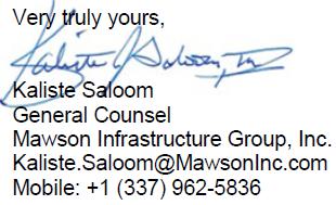 Unless otherwise authorized by me, you are to direct all further communications only to me at the above address or using below contact information, and to no other Mawson entity or any of their employees, directors, officers, agents, representatives, or legal counsel.