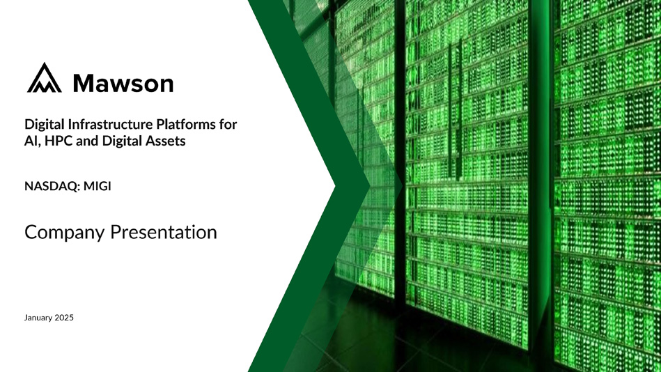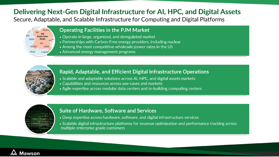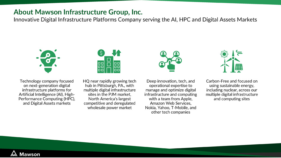 Technology company focused on next - generation digital infrastructure platforms for Artificial Intelligence (AI), High - Performance Computing (HPC), and Digital Assets markets HQ near rapidly growing tech hub in Pittsburgh, PA., with multiple digital infrastructure sites in the PJM market, North America's largest competitive and deregulated wholesale power market Deep innovation, tech, and operational expertise to manage and optimize digital infrastructure and computing with a team from Apple, Amazon Web Services, Nokia, Yahoo, T - Mobile, and other tech companies Carbon - Free and focused on using sustainable energy, including nuclear, across our multiple digital infrastructure and computing sites About Mawson Infrastructure Group, Inc. Innovative Digital Infrastructure Platforms Company serving the AI, HPC and Digital Assets Markets