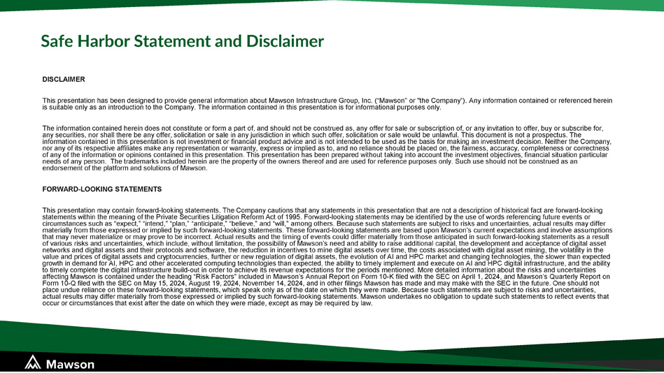 DISCLAIMER This presentation has been designed to provide general information about Mawson Infrastructure Group, Inc. (“Mawson” or "the Company”). Any information contained or referenced herein is suitable only as an introduction to the Company. The information contained in this presentation is for informational purposes only. The information contained herein does not constitute or form a part of, and should not be construed as, any offer for sale or subscription of, or any invitation to offer, buy or subscribe for, any securities, nor shall there be any offer, solicitation or sale in any jurisdiction in which such offer, solicitation or sale would be unlawful. This document is not a prospectus. The information contained in this presentation is not investment or financial product advice and is not intended to be used as the basis for making an investment decision. Neither the Company, nor any of its respective affiliates make any representation or warranty, express or implied as to, and no reliance should be placed on, the fairness, accuracy, completeness or correctness of any of the information or opinions contained in this presentation. This presentation has been prepared without taking into account the investment objectives, financial situation particular needs of any person. The trademarks included herein are the property of the owners thereof and are used for reference purposes only. Such use should not be construed as an endorsement of the platform and solutions of Mawson. FORWARD - LOOKING STATEMENTS This presentation may contain forward - looking statements. The Company cautions that any statements in this presentation that are not a description of historical fact are forward - looking statements within the meaning of the Private Securities Litigation Reform Act of 1995. Forward - looking statements may be identified by the use of words referencing future events or circumstances such as “expect,” “intend,” “plan,” “anticipate,” “believe,” and “will,” among others. Because such statements are subject to risks and uncertainties, actual results may differ materially from those expressed or implied by such forward - looking statements. These forward - looking statements are based upon Mawson’s current expectations and involve assumptions that may never materialize or may prove to be incorrect. Actual results and the timing of events could differ materially from those anticipated in such forward - looking statements as a result of various risks and uncertainties, which include, without limitation, the possibility of Mawson’s need and ability to raise additional capital, the development and acceptance of digital asset networks and digital assets and their protocols and software, the reduction in incentives to mine digital assets over time, the costs associated with digital asset mining, the volatility in the value and prices of digital assets and cryptocurrencies, further or new regulation of digital assets, the evolution of AI and HPC market and changing technologies, the slower than expected growth in demand for AI, HPC and other accelerated computing technologies than expected, the ability to timely implement and execute on AI and HPC digital infrastructure, and the ability to timely complete the digital infrastructure build - out in order to achieve its revenue expectations for the periods mentioned. More detailed information about the risks and uncertainties affecting Mawson is contained under the heading “Risk Factors” included in Mawson’s Annual Report on Form 10 - K filed with the SEC on April 1, 2024, and Mawson’s Quarterly Report on Form 10 - Q filed with the SEC on May 15, 2024, August 19, 2024, November 14, 2024, and in other filings Mawson has made and may make with the SEC in the future. One should not place undue reliance on these forward - looking statements, which speak only as of the date on which they were made. Because such statements are subject to risks and uncertainties, actual results may differ materially from those expressed or implied by such forward - looking statements. Mawson undertakes no obligation to update such statements to reflect events that occur or circumstances that exist after the date on which they were made, except as may be required by law. Safe Harbor Statement and Disclaimer