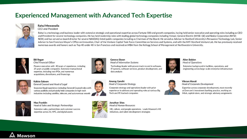 Experienced Management with Advanced Tech Expertise Rahul Mewawalla CEO and President Rahul is a technology and business leader with extensive strategic and operational expertise across Fortune 500 and growth companies, having held senior executive and operating roles including as CEO and President for several technology companies. He has held leadership roles with leading global technology companies including Yahoo!, General Electric (NYSE: GE) and Nokia Corporation (NYSE: NOK) and has served as board director for several NASDAQ - listed public companies including as Chairman of the Board. He served as Advisor to Stanford University's Persuasive Technology Lab, Senior Advisor to San Francisco Mayor’s Office on Innovation, Chair of the Venture Capital Task Force Committee on Services and Systems, and with the MIT - Stanford Venture Lab. He has previously received numerous awards and honors such as Top 40 under 40 in San Francisco and received an MBA from the Kellogg School of Management at Northwestern University. Geneva Skeen Head of Information Systems Technology leader with proven track record in software, IT systems, software services, product development, and data analysis Allen Bolden Head of Operations Extensive background in facilities, operations, and engineering across large - scale enterprise infrastructure Max Franklin Head of Sales and Strategic Partnerships Extensive sales, partnerships and customer success expertise across AI, HPC, and digital assets Kaliste Saloom General Counsel and Head of Legal Seasoned legal experience including General Counsel roles with various publicly and privately held companies in high - tech industries including satellite, telecom, and autonomous vessels Vikram Murali Head of Corporate Development Expertise across corporate development, most recently at Evercore’s investment banking practice, working on M&A, capital raises, and strategic advisory assignments Jonathan Sites Head of Human Resources HR, culture, and people operations. Leads Mawson’s HR initiatives, and talent development strategies Bill Regan Chief Financial Officer Finance executive with 40 years of experience, including 25 years at public companies. Extensive transactional expertise, including two IPOs, and numerous acquisitions, divestitures, and financings. Anurag Gandhi Head of Corporate Strategy Corporate strategy and operations leader with prior experience in advisory and operating roles at various Big Tech and PE - backed companies
