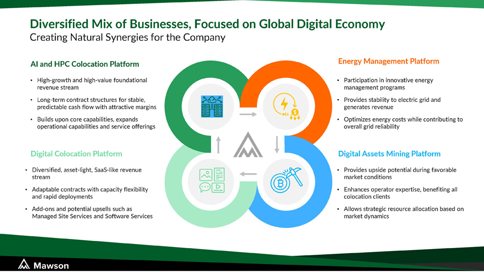 • Diversified, asset - light, SaaS - like revenue stream • Adaptable contracts with capacity flexibility and rapid deployments • Add - ons and potential upsells such as Managed Site Services and Software Services Diversified Mix of Businesses, Focused on Global Digital Economy Creating Natural Synergies for the Company • Participation in innovative energy management programs • Provides stability to electric grid and generates revenue • Optimizes energy costs while contributing to overall grid reliability Digital Assets Mining Platform • High - growth and high - value foundational revenue stream • Long - term contract structures for stable, predictable cash flow with attractive margins • Builds upon core capabilities, expands operational capabilities and service offerings AI and HPC Colocation Platform Energy Management Platform • Provides upside potential during favorable market conditions • Enhances operator expertise, benefiting all colocation clients • Allows strategic resource allocation based on market dynamics Digital Colocation Platform