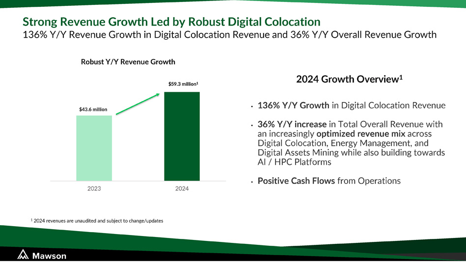 2023 2024 Robust Y/Y Revenue Growth Strong Revenue Growth Led by Robust Digital Colocation 136% Y/Y Revenue Growth in Digital Colocation Revenue and 36% Y/Y Overall Revenue Growth 1 2024 revenues are unaudited and subject to change/updates 2024 Growth Overview 1 • 136% Y/Y Growth in Digital Colocation Revenue • 36% Y/Y increase in Total Overall Revenue with an increasingly optimized revenue mix across Digital Colocation, Energy Management, and Digital Assets Mining while also building towards AI / HPC Platforms • Positive Cash Flows from Operations $43.6 million $59.3 million 1