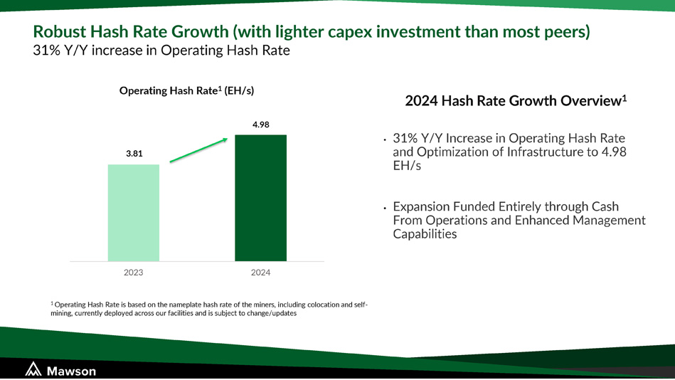 Robust Hash Rate Growth (with lighter capex investment than most peers) 31% Y/Y increase in Operating Hash Rate 2023 2024 Operating Hash Rate 1 (EH/s) 1 Operating Hash Rate is based on the nameplate hash rate of the miners, including colocation and self - mining, currently deployed across our facilities and is subject to change/updates 2024 Hash Rate Growth Overview 1 • 31 % Y/Y Increase in Operating Hash Rate and Optimization of Infrastructure to 4 . 98 EH/s • Expansion Funded Entirely through Cash From Operations and Enhanced Management Capabilities 3.81 4.98