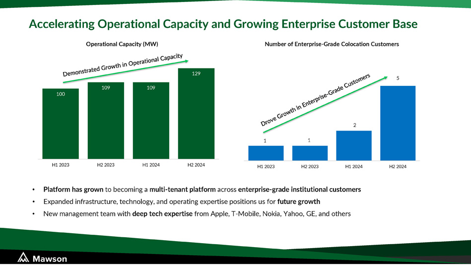 1 1 2 5 H1 2023 H2 2023 H1 2024 H2 2024 Accelerating Operational Capacity and Growing Enterprise Customer Base 100 109 109 129 Operational Capacity (MW) Number of Enterprise - Grade Colocation Customers H1 2023 H2 2023 H1 2024 H2 2024 • Platform has grown to becoming a multi - tenant platform across enterprise - grade institutional customers • Expanded infrastructure, technology, and operating expertise positions us for future growth • New management team with deep tech expertise from Apple, T - Mobile, Nokia, Yahoo, GE, and others